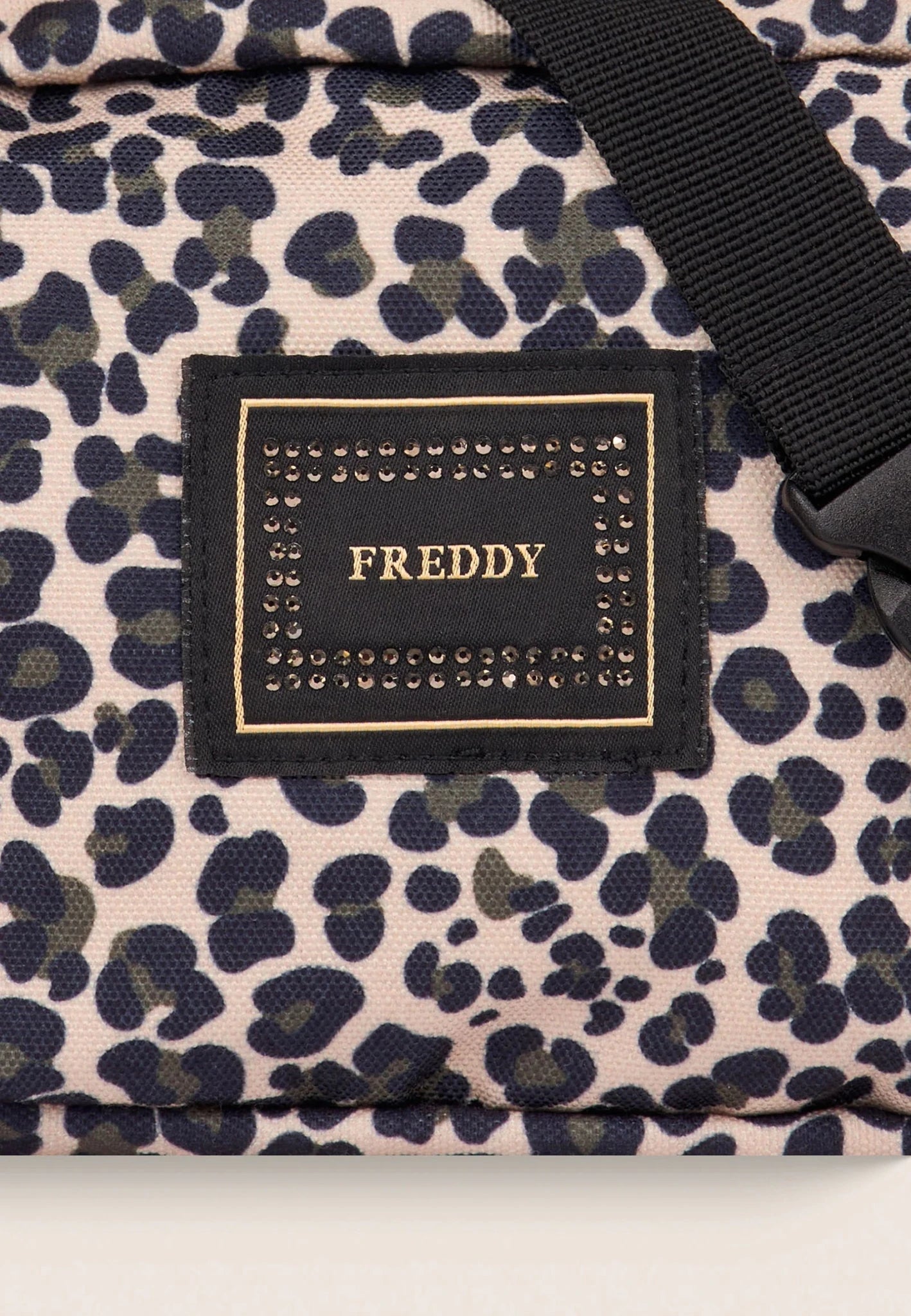 Dallo stile audace e pratico, questa borsa/marsupio in canvas con fantasia animalier è l'accessorio perfetto per chi cerca un tocco di personalità e comodità. La tracolla regolabile con fibbia a scatto ti permette di indossarla comodamente come borsa a tracolla o come marsupio. La chiusura zip sul lato superiore garantisce sicurezza per i tuoi oggetti, mentre l'etichetta in tessuto con il logo FREDDY, arricchita da strass applicati, impreziosisce il lato esterno, conferendo un dettaglio luminoso e distintivo