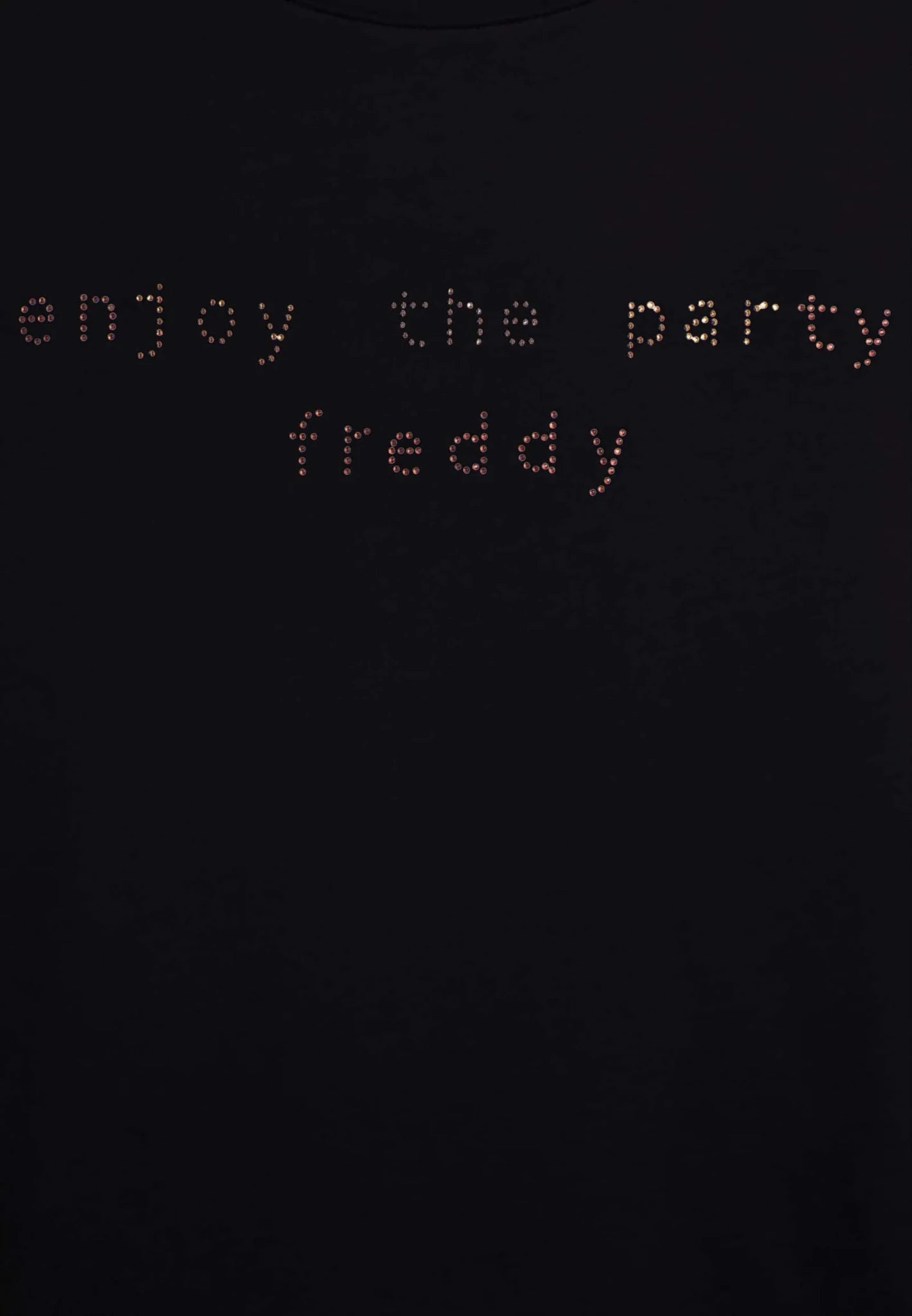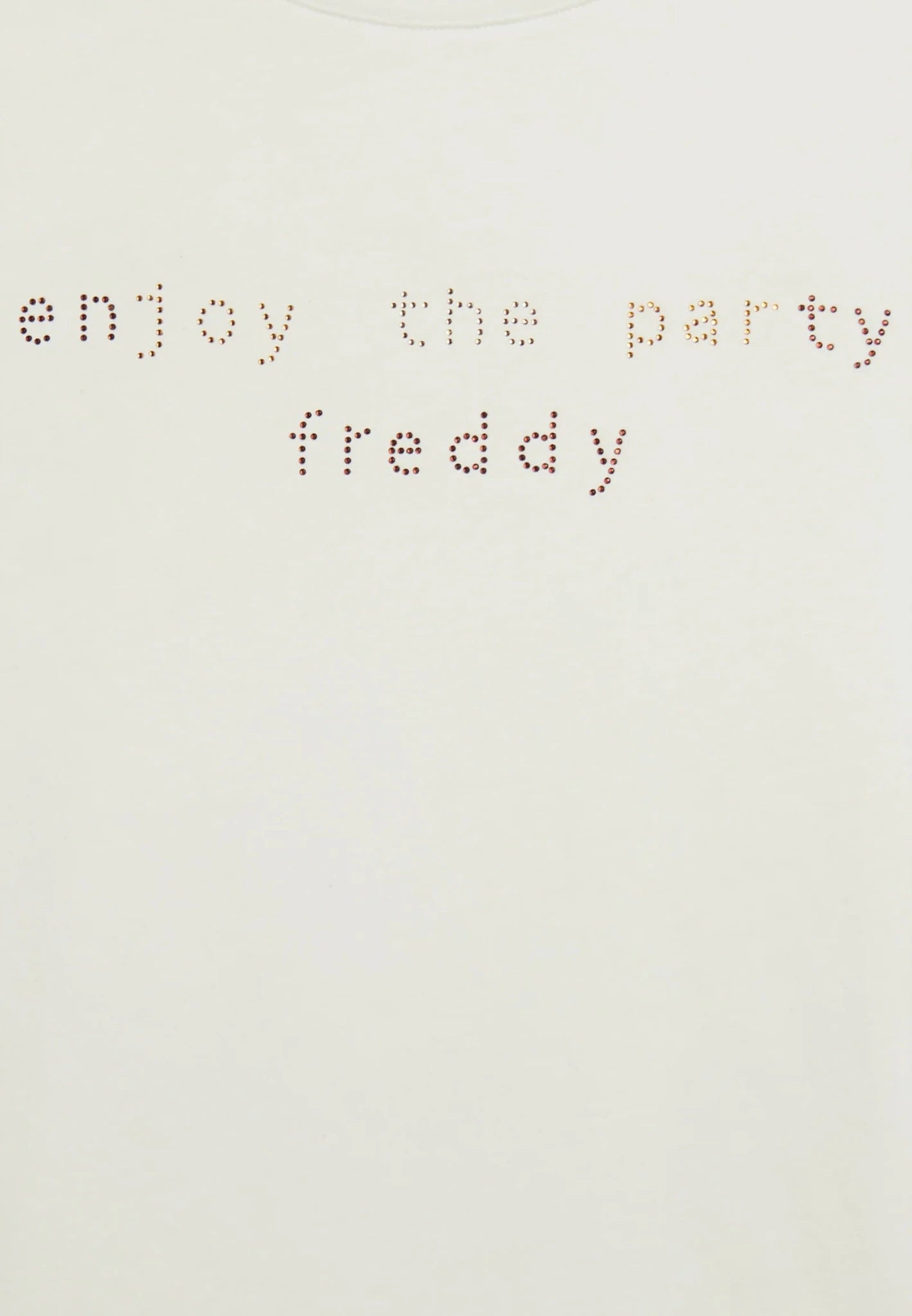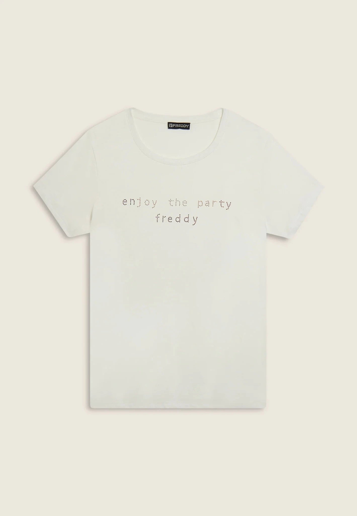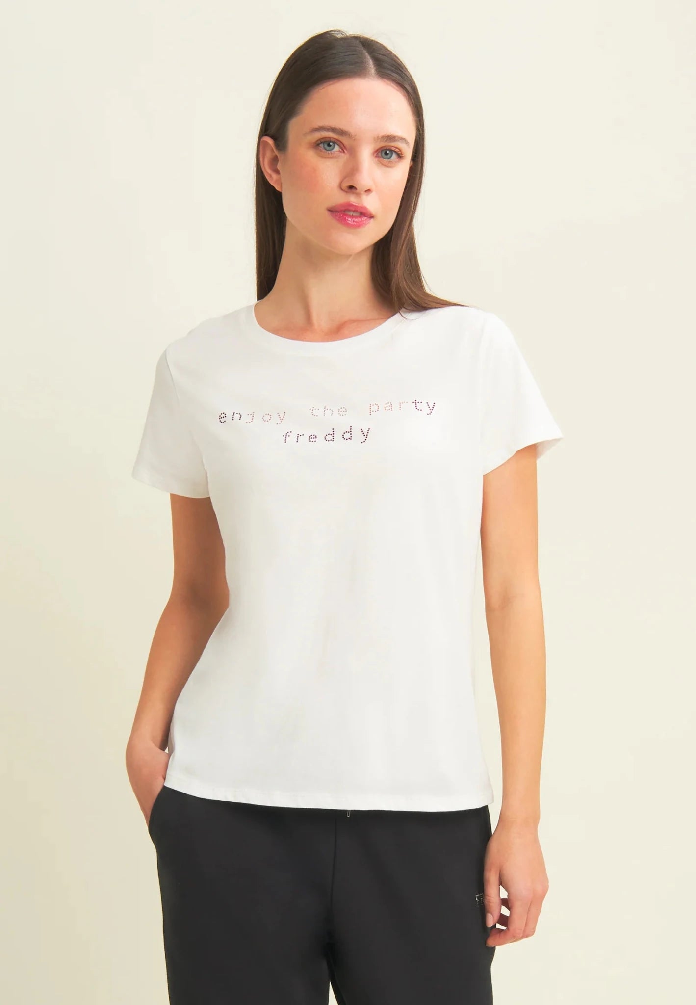 Questa t-shirt regular fit in cotone Supima abbina la morbidezza del tessuto a un design brillante e femminile. La scritta “enjoy the party freddy” in strass multicolor dona un tocco vivace ma raffinato, perfetto per un look casual con personalità. Il jersey Supima assicura una qualità superiore e una vestibilità impeccabile.
