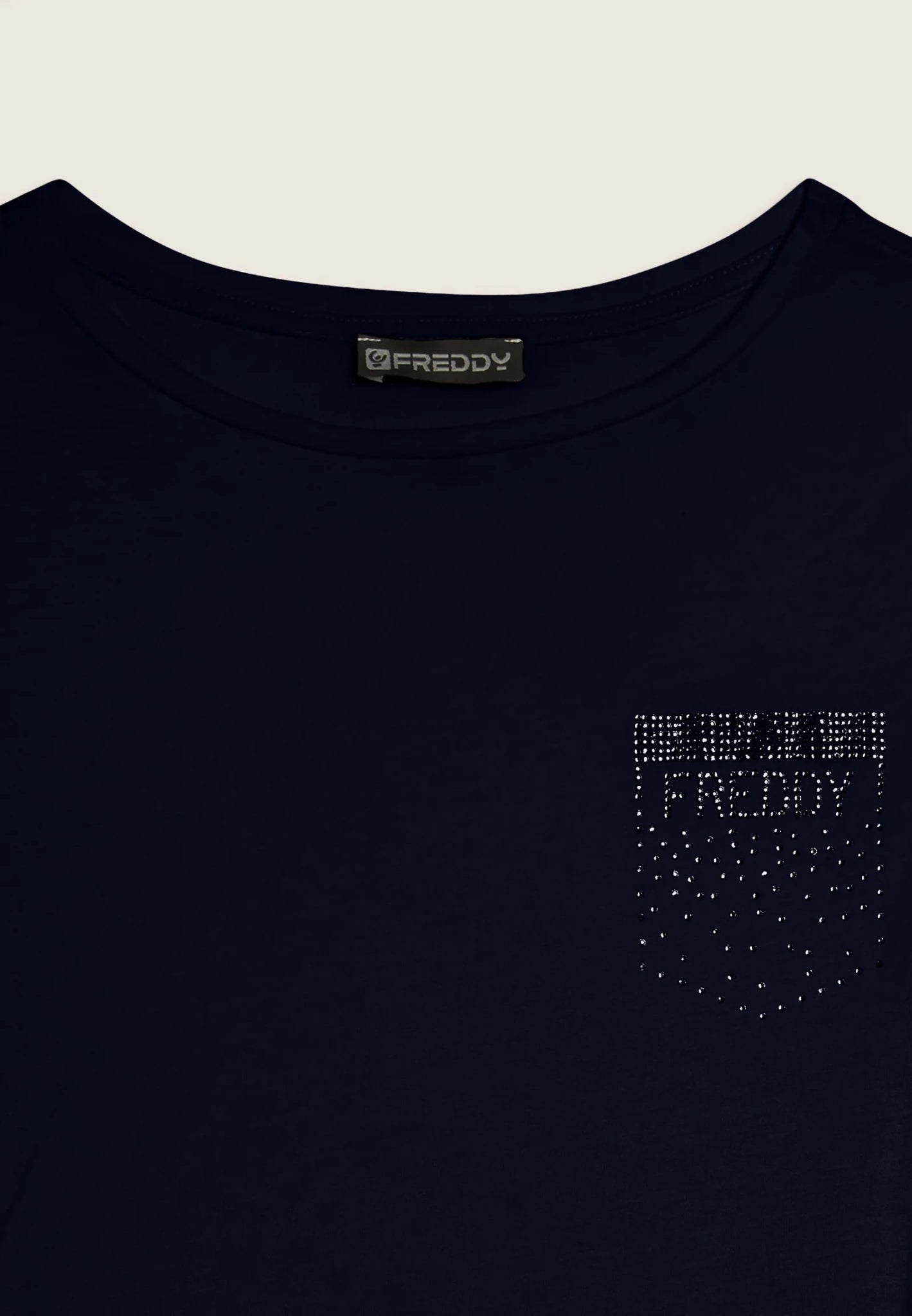 T-shirt a manica corta con vestibilità regular e fondo dritto, arricchita da piccoli spacchi laterali. Il collo girocollo e le maniche corte creano una silhouette semplice ma elegante. La decorazione strass, a forma di taschino sul cuore con il logo FREDDY, dona un tocco luminoso e raffinato. Realizzata in Jersey di Cotone e Modal, la t-shirt garantisce morbidezza, comfort e una sensazione di freschezza grazie alla sua texture liscia e leggera