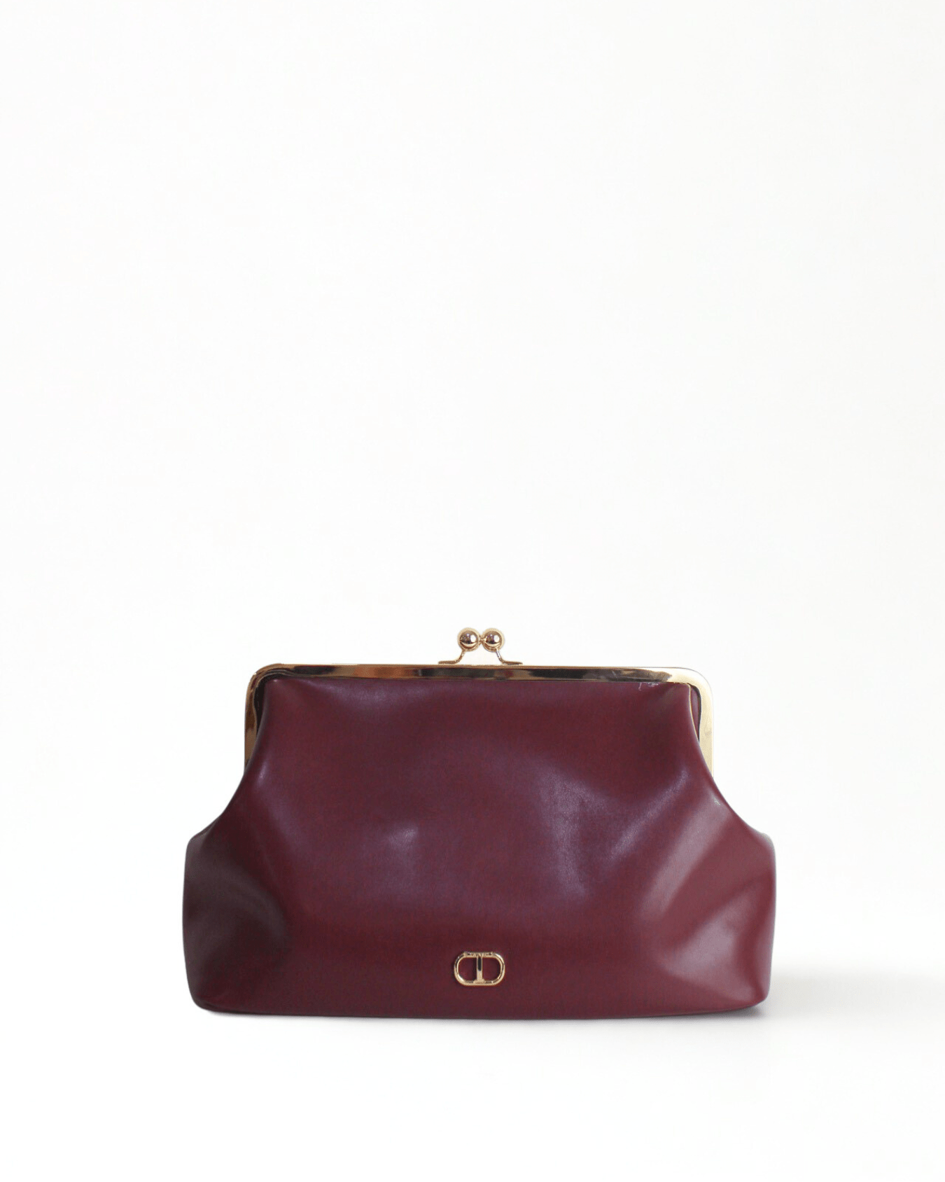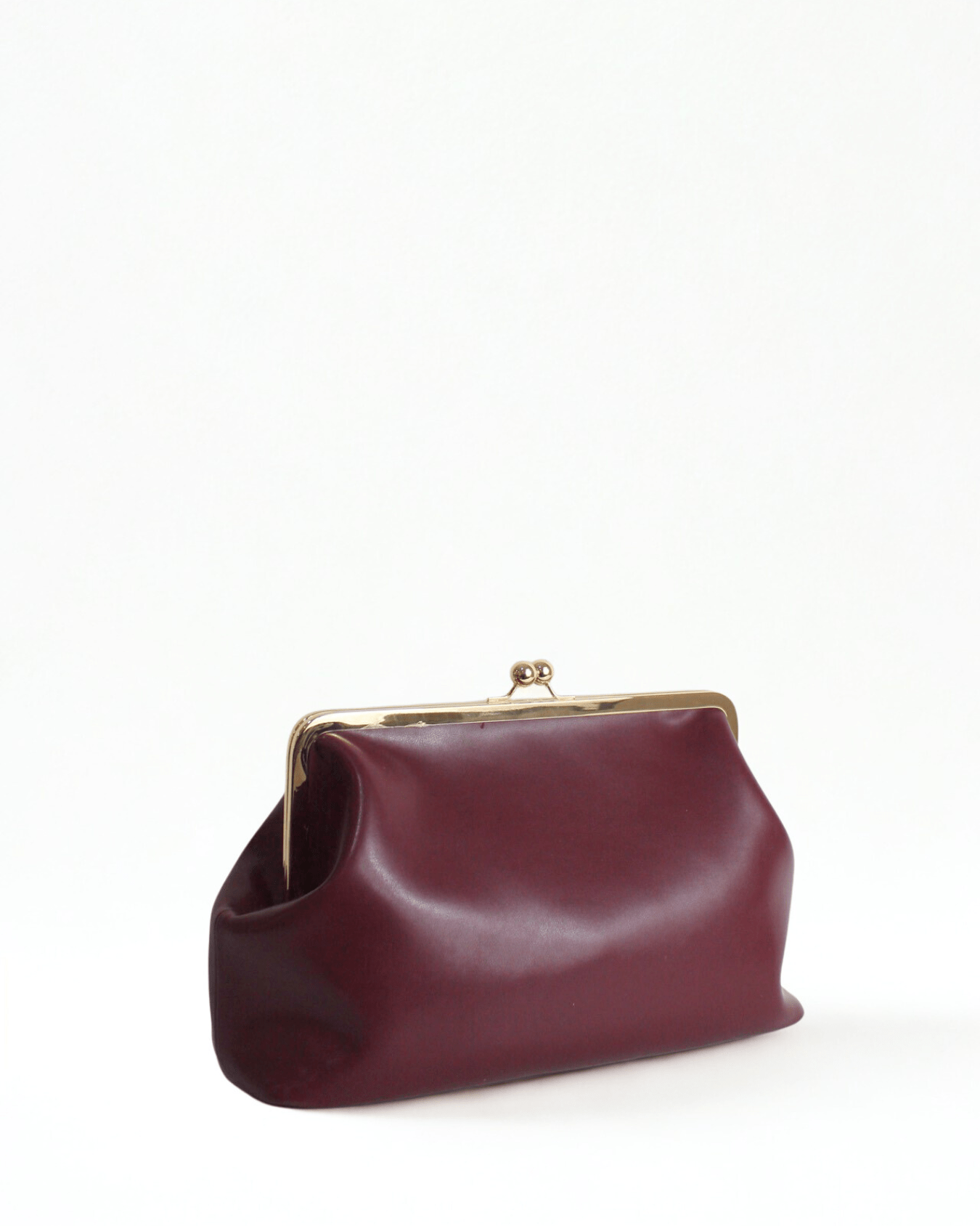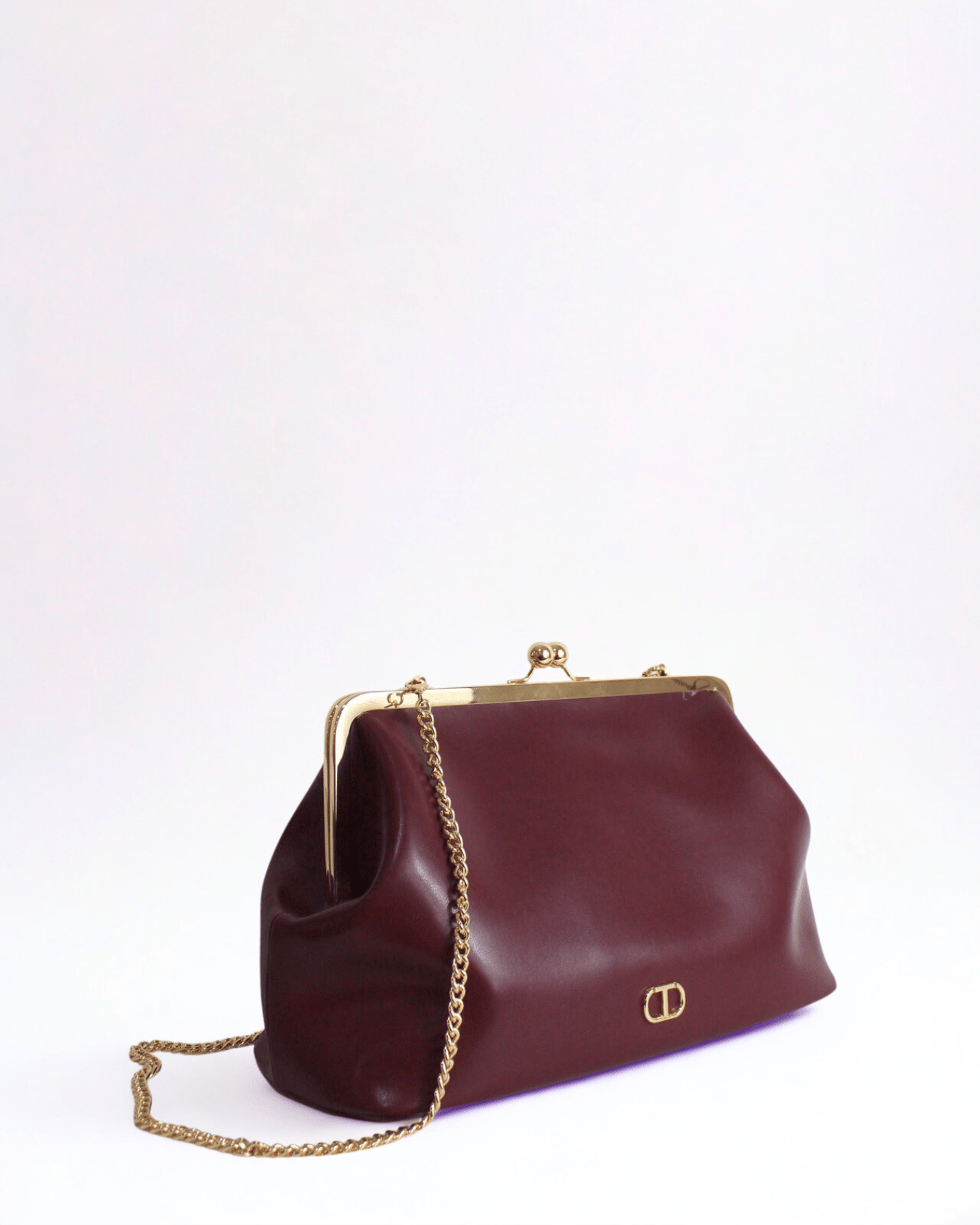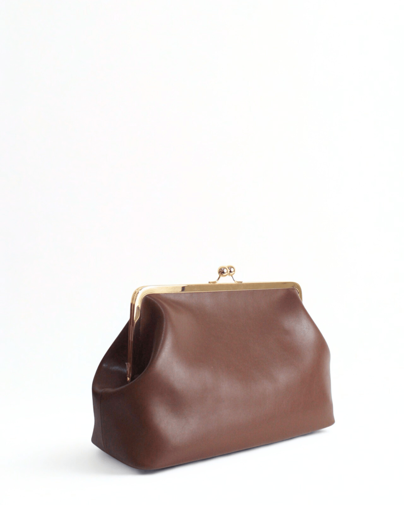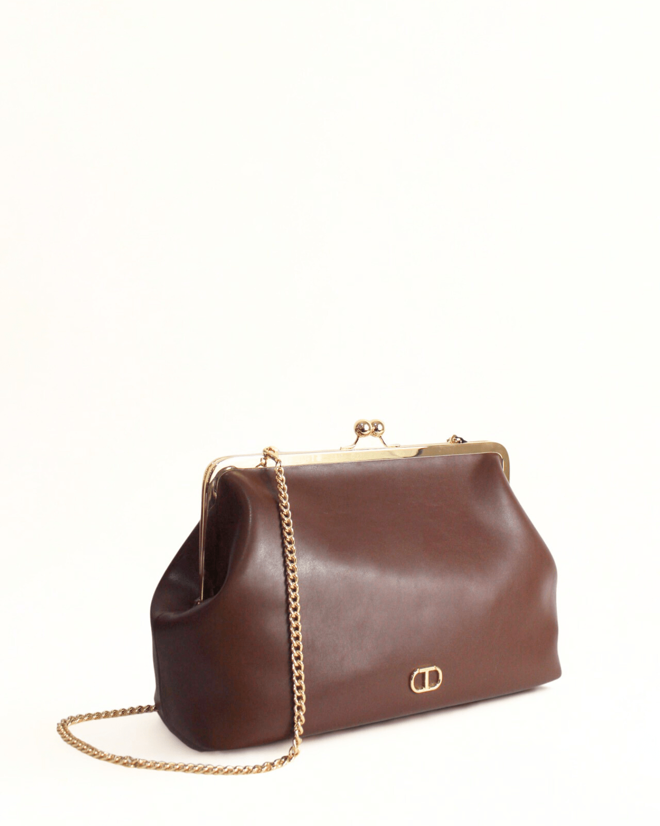 Borsa a tracolla modello maxi clutch effetto pelle di vitello nappato naturale liscio. Ha cerniera in metallo con chiusura a scatto con sfere, logo Oval T in metallo, tracolla rimovibile a comparsa in catena.