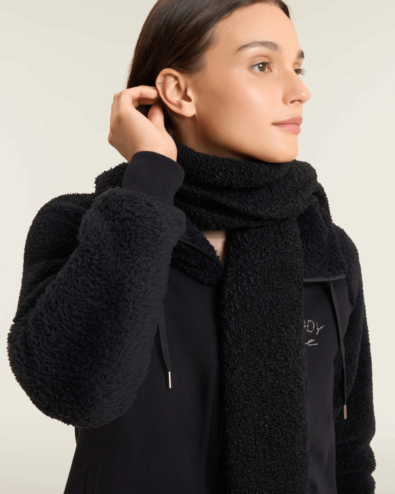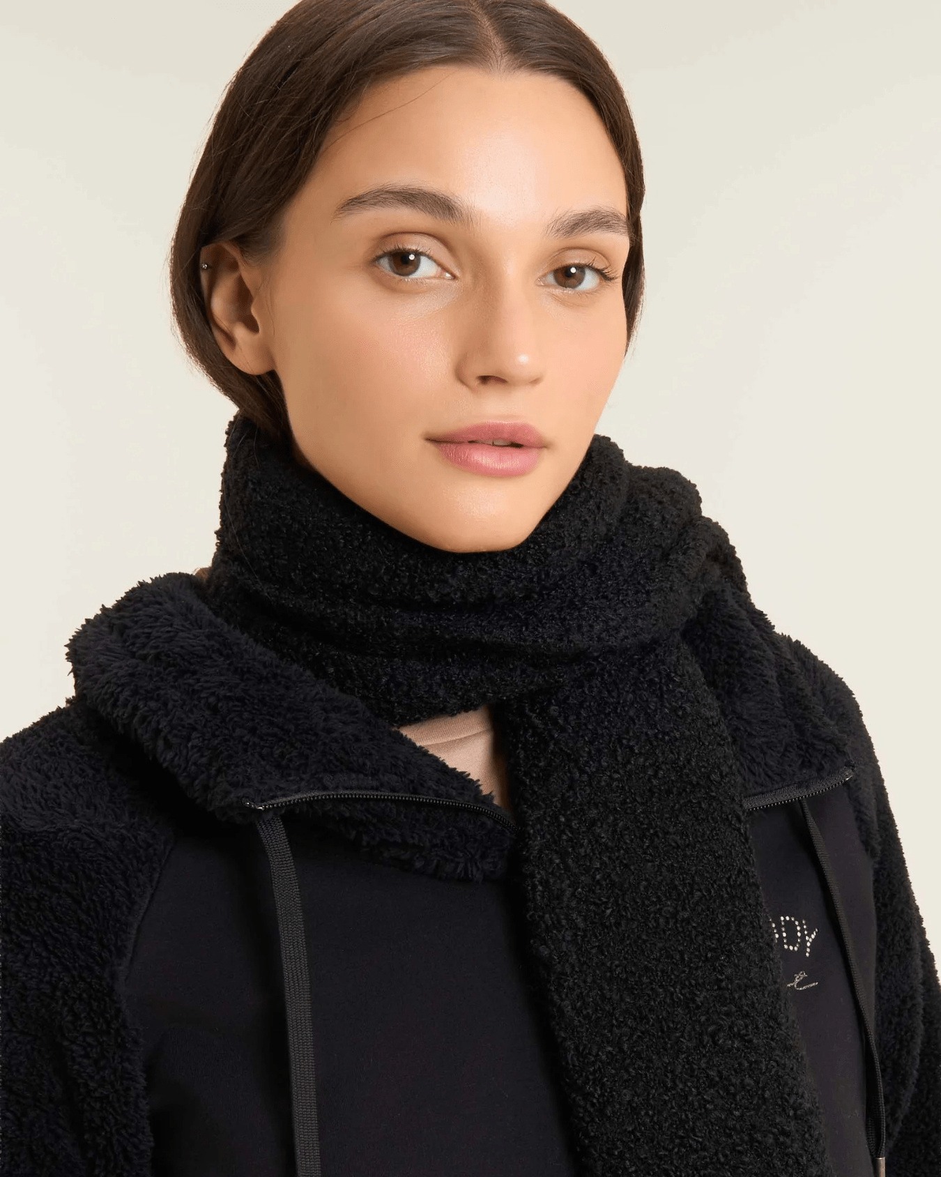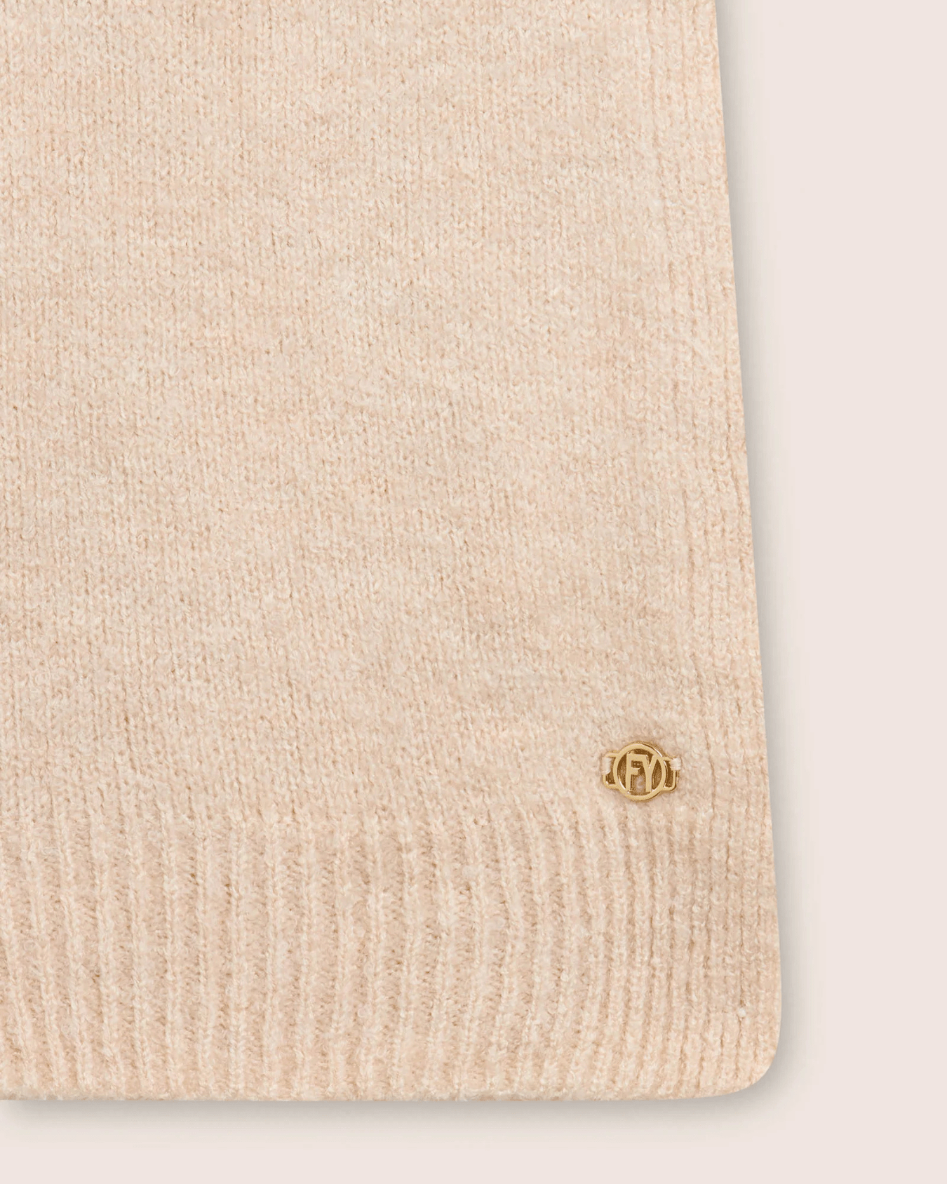 Avvolgente, soffice e dallo stile chic: questa sciarpa in tessuto bouclé effetto lana è pensata per un look invernale caldo e raffinato. La texture vaporosa e l'effetto "peluche" la rendono estremamente piacevole da indossare, mentre il logo FY dorato applicato sul fondo aggiunge un tocco luminoso e sofisticato.