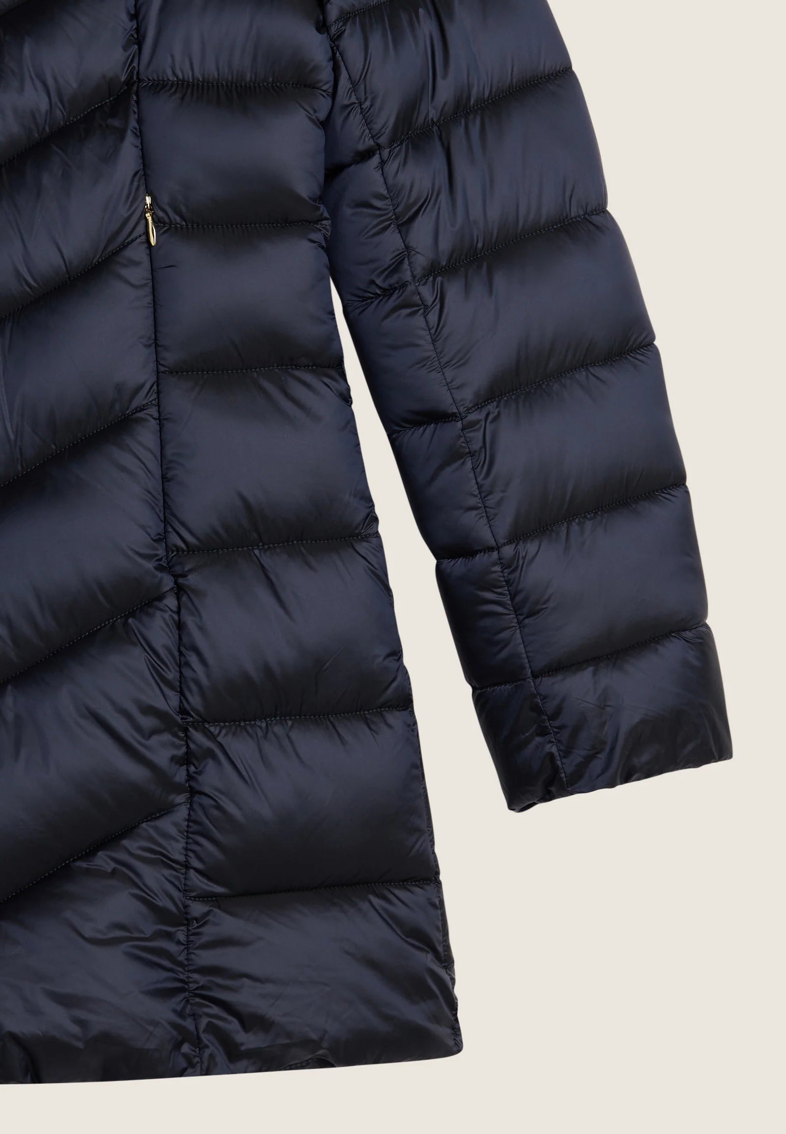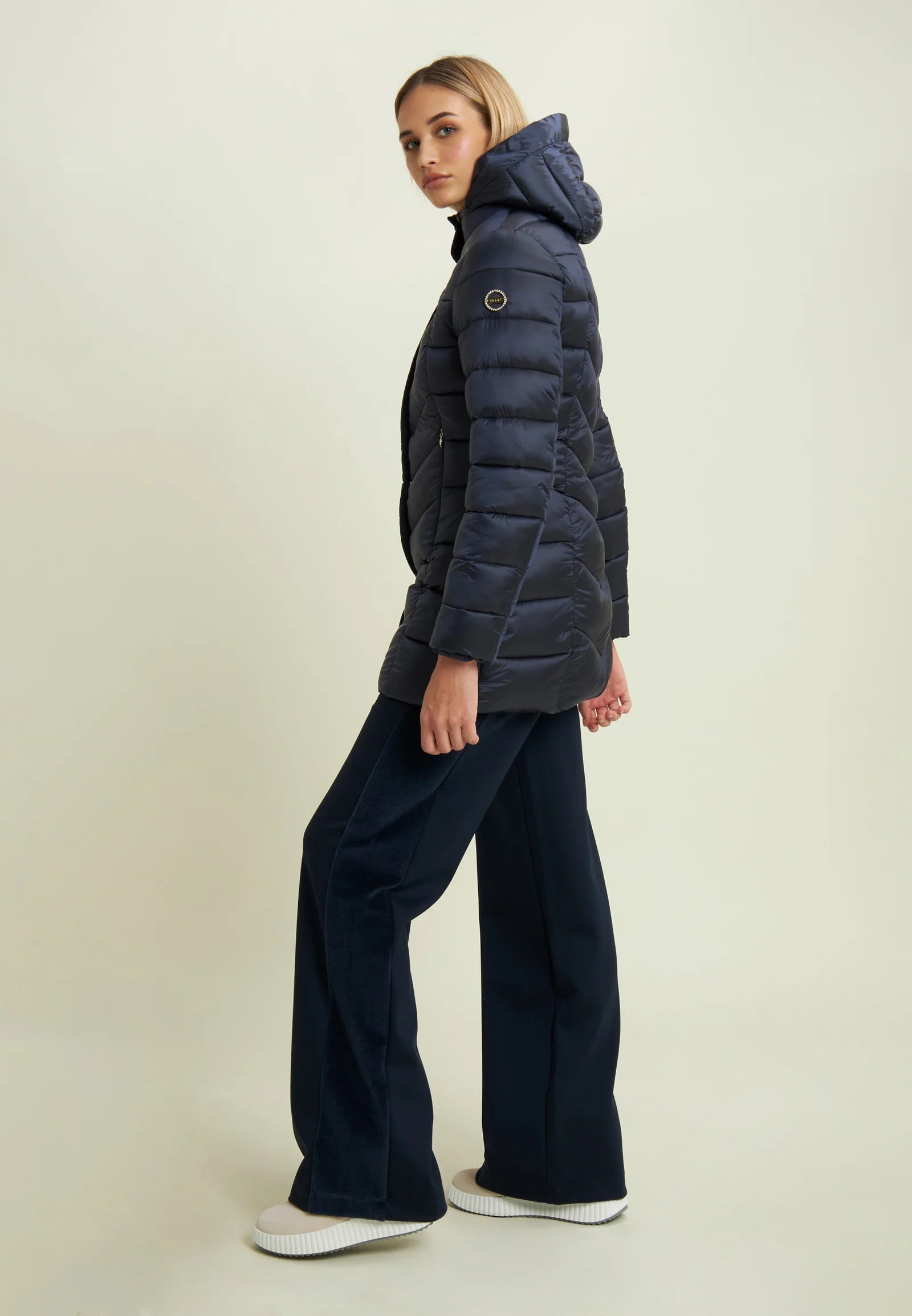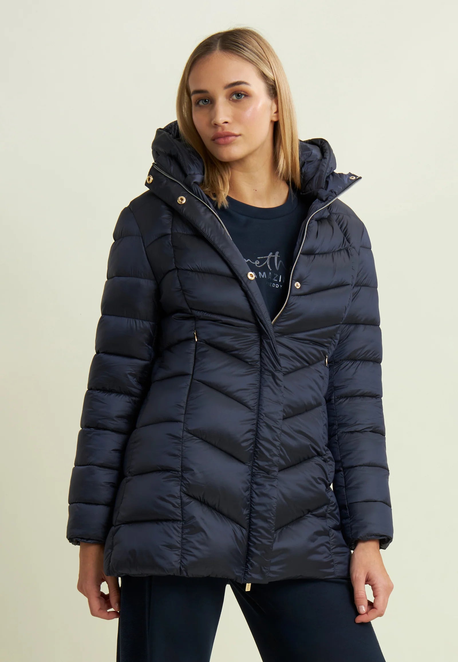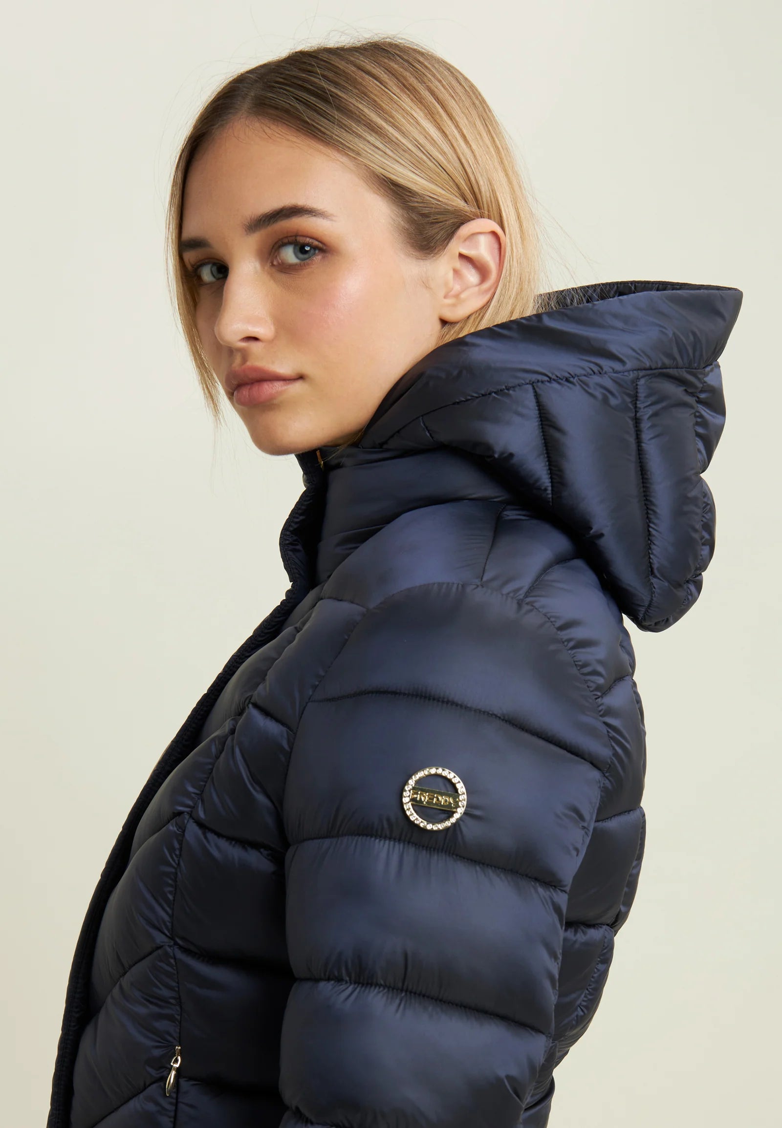 Pratico e caldo, questo piumino trapuntato ha una vestibilità regular e lunghezza sotto ai fianchi. Dotato di chiusura full zip e bottoni a pressione, presenta cappuccio e collo alto per una protezione completa dal freddo. Imbottitura in fake-down animal-friendly, ideale anche in condizioni umide. Tasche frontali con zip e logo strass sulla manica sinistra aggiungono un tocco femminile e funzionale.