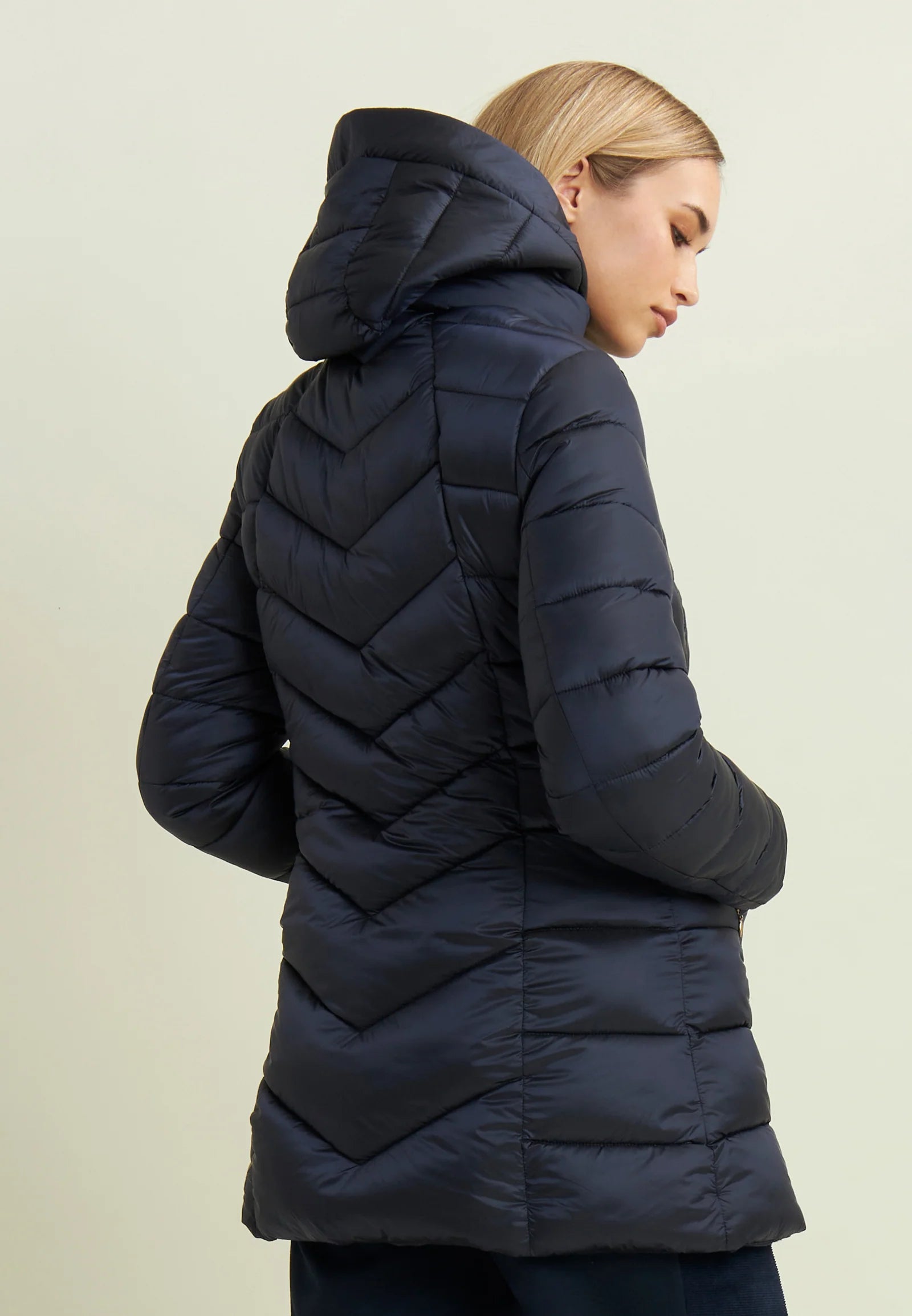 Piumino donna trapuntato con cappuccio e bottoni a pressione