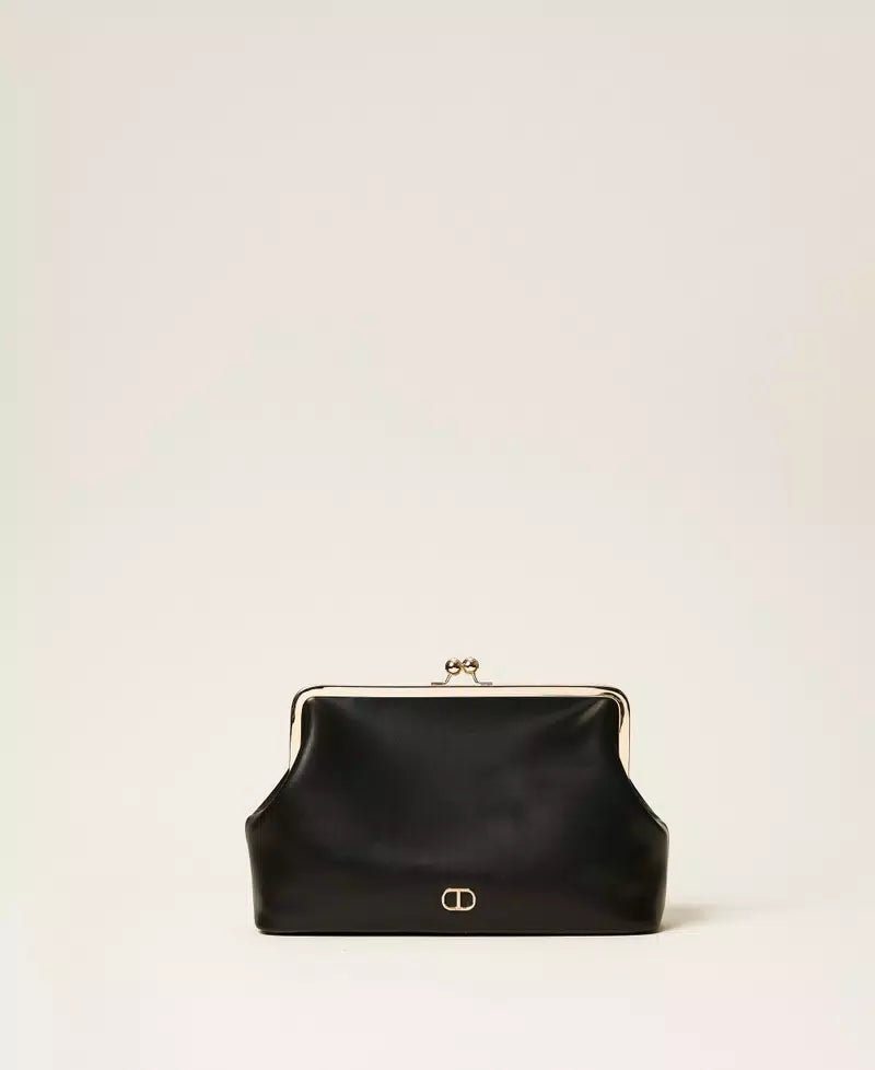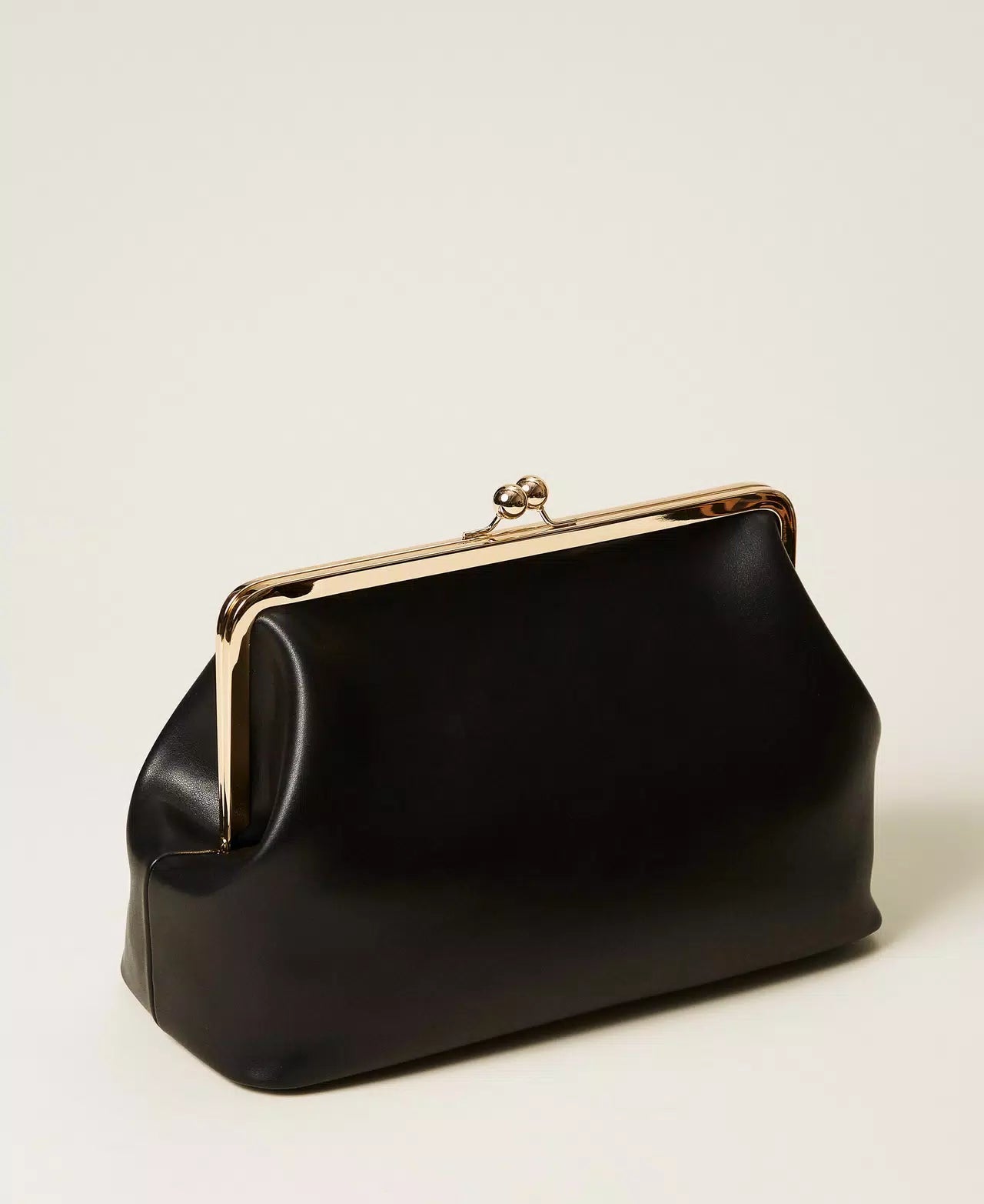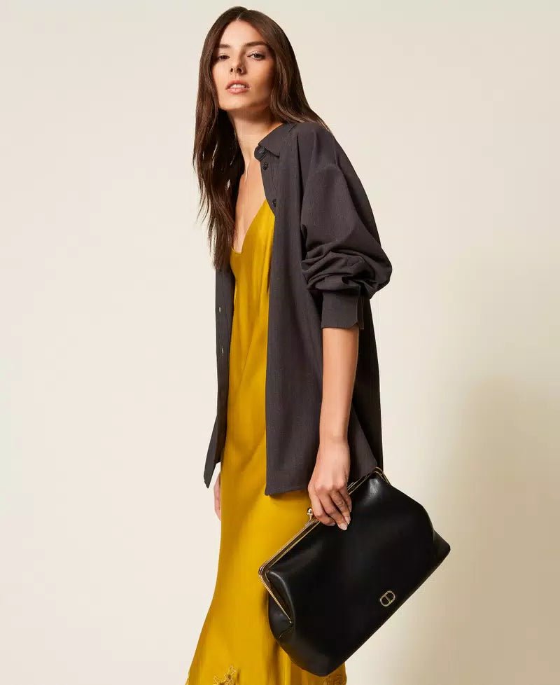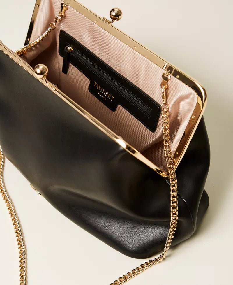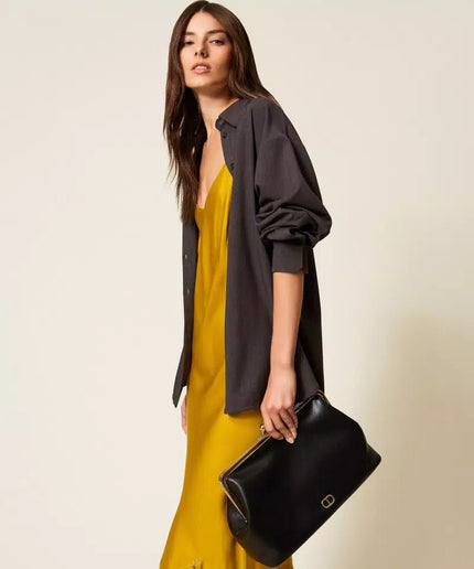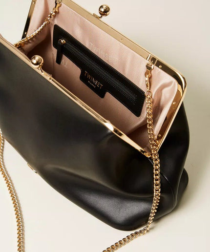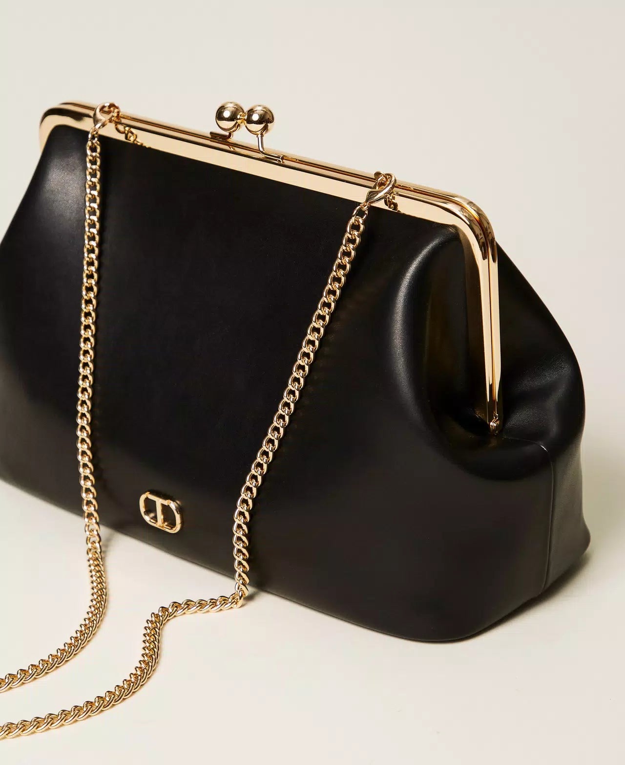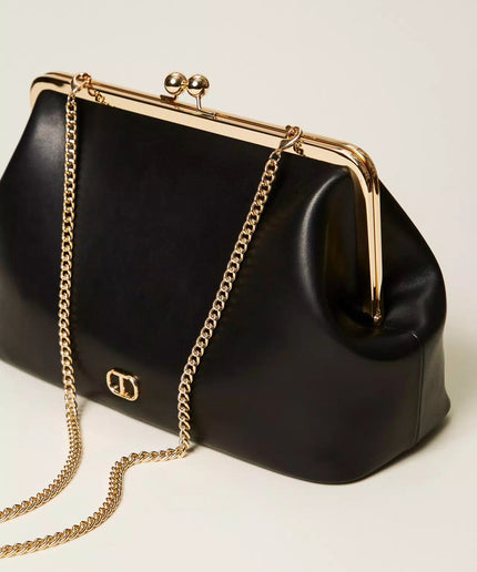 Borsa a tracolla modello maxi clutch effetto pelle di vitello nappato naturale liscio. Ha cerniera in metallo con chiusura a scatto con sfere, logo Oval T in metallo, tracolla rimovibile a comparsa in catena.