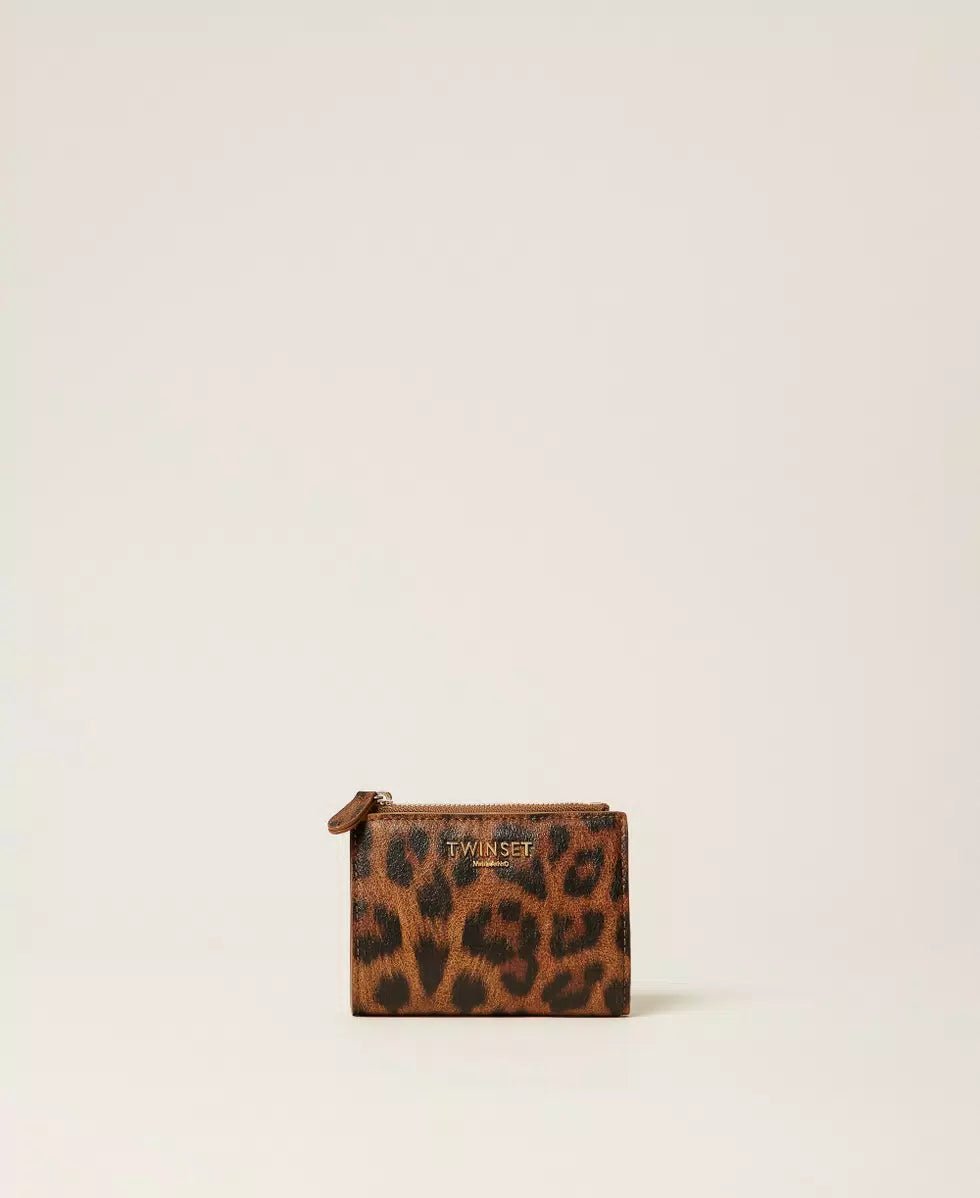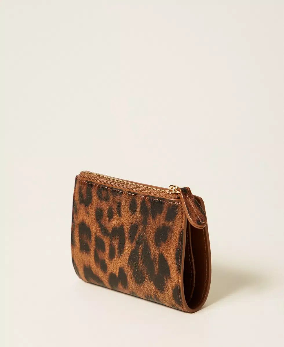 Portafoglio piccolo effetto pelle con stampa che riproduce una macchiatura a leopardo. Grande funzionalità interna con tasche portacarte, tasca per contanti e taschina con zip portamonete, logo lettering in metallo.
