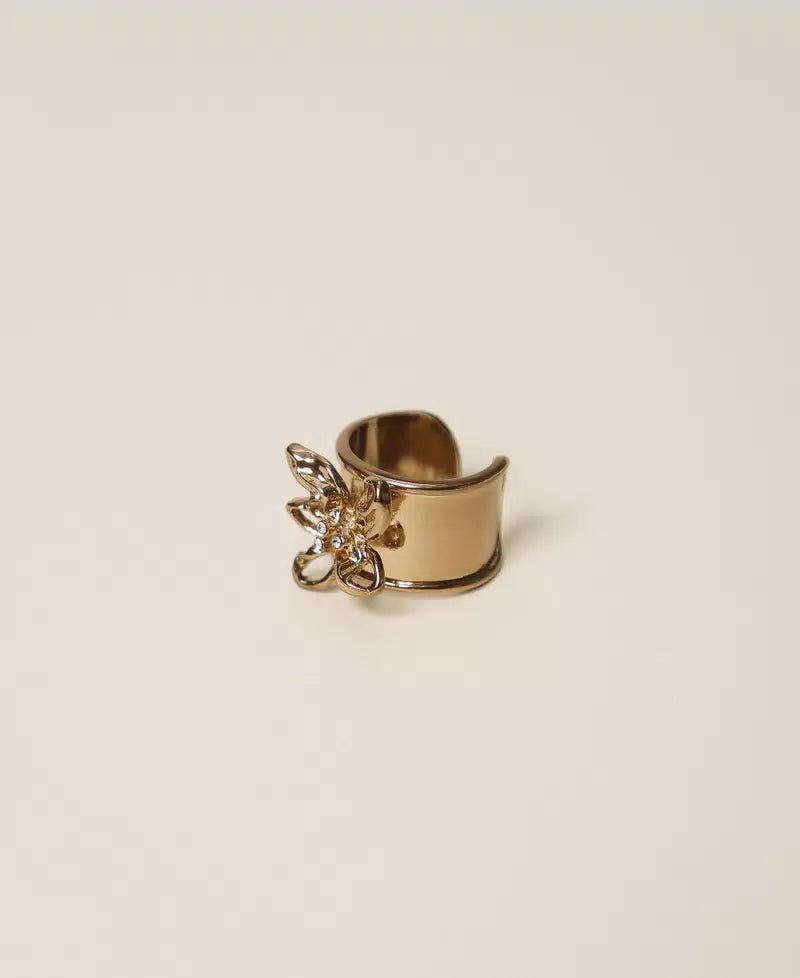 Anello in zama con fiore in filigrana impreziosito da castoni strass, profili in rilievo, galvanica color oro anticato, apertura sul retro per adattarsi a diversi fit.