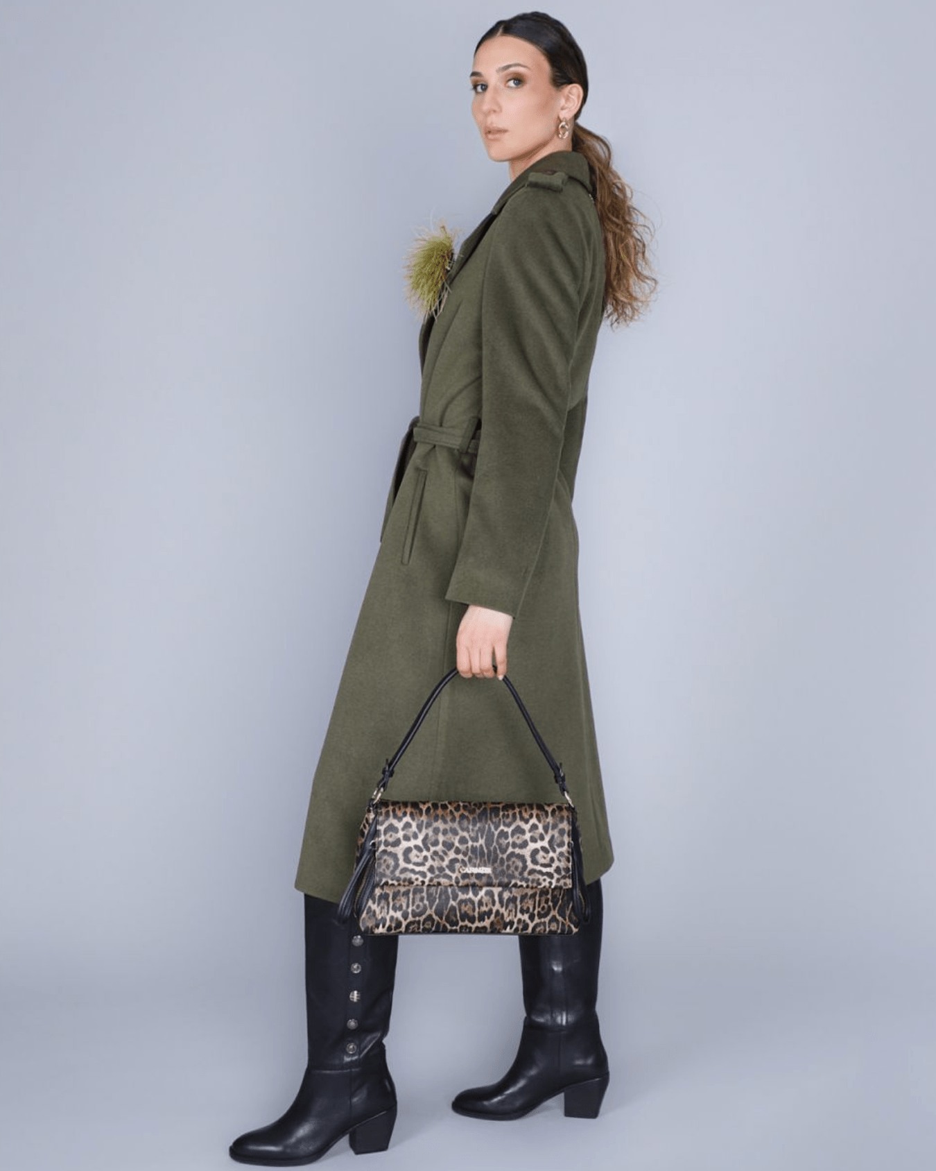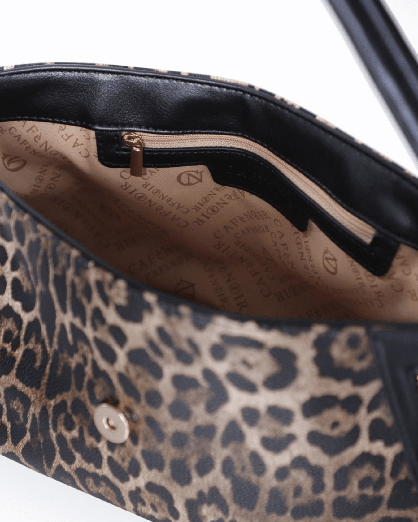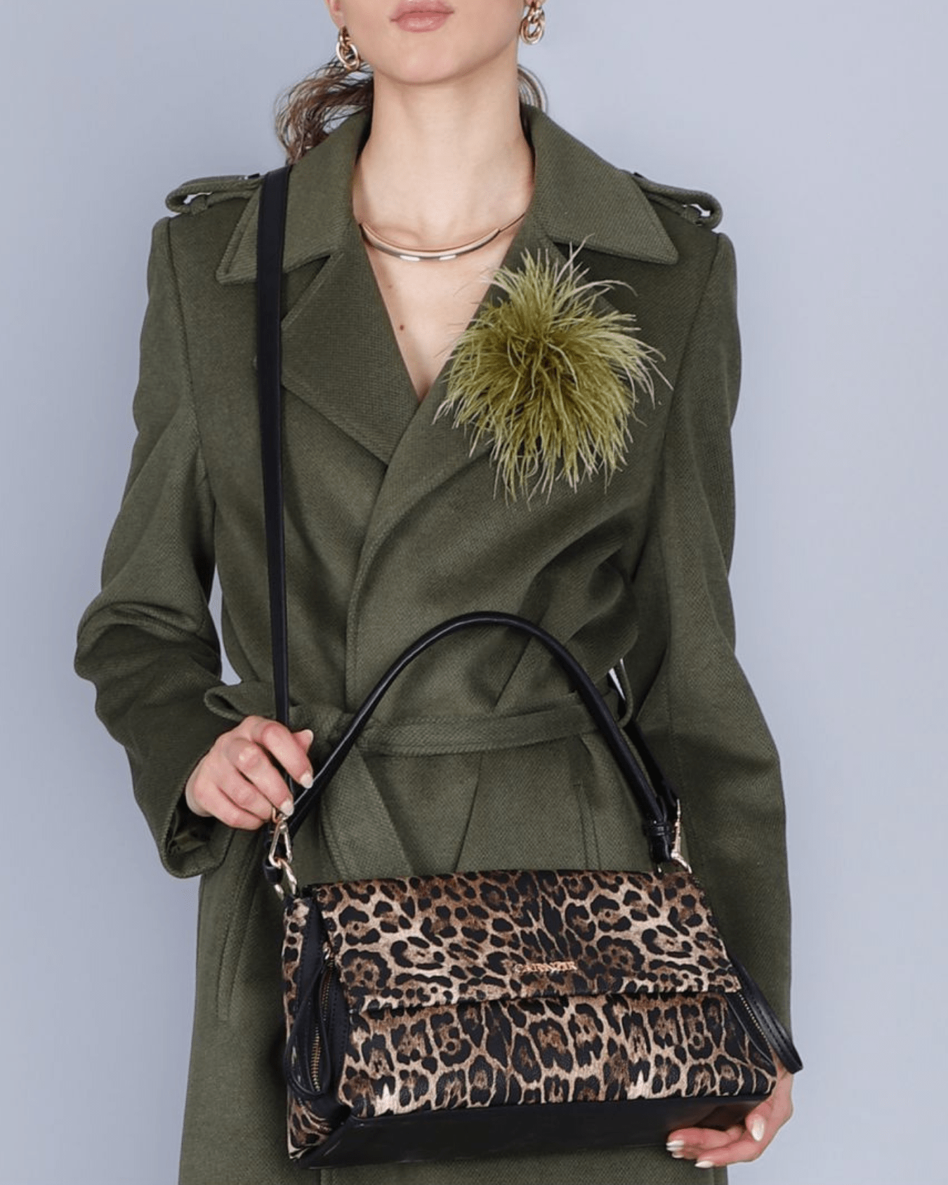 Questa borsa a spalla unisce audacia e versatilità con la sua morbida silhouette in effetto pelle, arricchita da una pattina leopardata che dona un tocco di carattere. La chiusura con zip e il charm in metallo aggiungono dettagli raffinati, mentre la tracolla removibile permette di adattarla facilmente a ogni look, dal giorno alla sera. Perfetta per chi vuole distinguersi con stile.