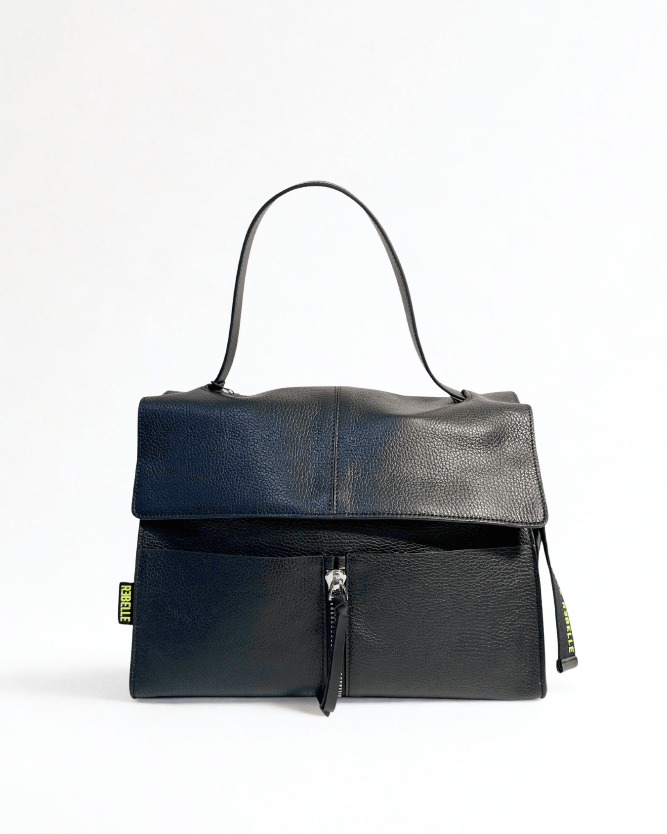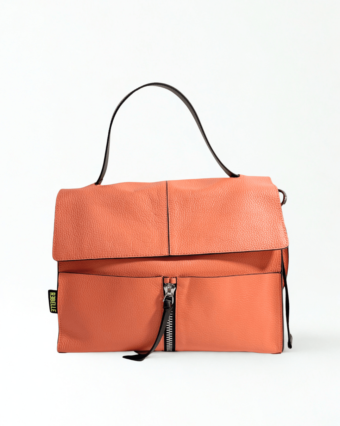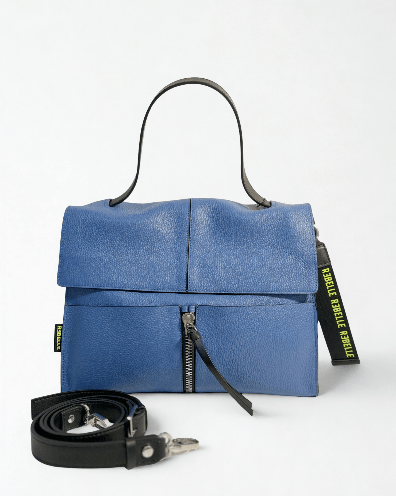 Lei è CLIO,  la nostra borsa a cartella in vera pelle che fa parte della collezione BASIC. CLIO è il must have della collezione Rebelle, una borsa comoda, pratica e alla moda. E' caratterizzata da una doppia portabilità, può essere portata a mano e grazie alla tracolla staccabile e regolabile,  può essere portata crossbody. L'interno è foderato e diviso in due scomparti molti ampi divisi da una tasca con zip. La borsa davanti ha due tasche porta oggetti. L'esterno è caratterizzato da un charms portachiavi staccabile abbellito dal logo fluo Rebelle