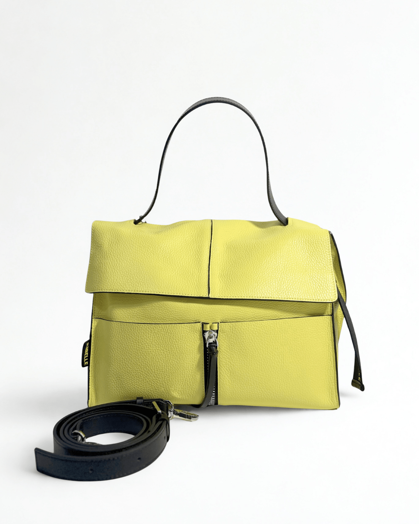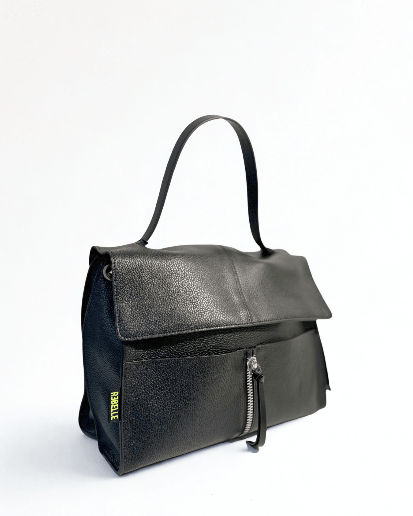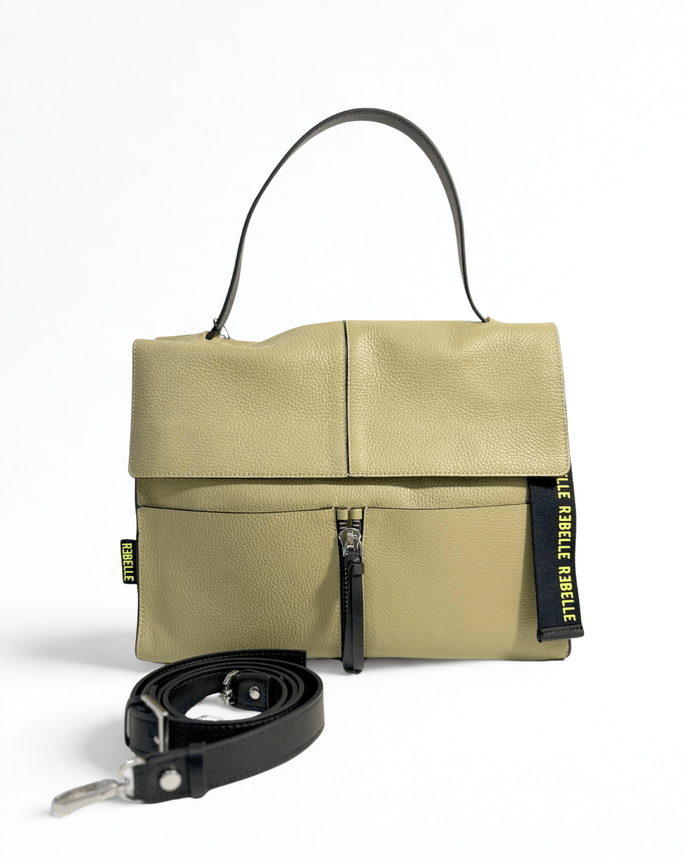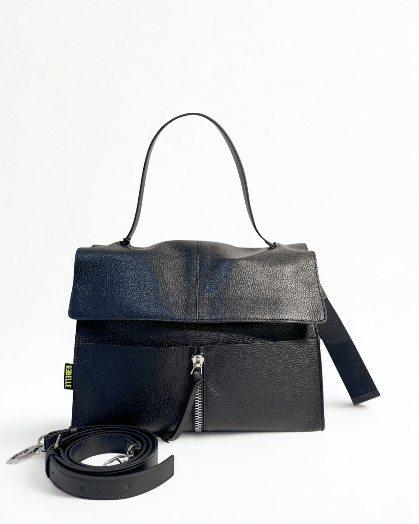Lei è CLIO,  la nostra borsa a cartella in vera pelle che fa parte della collezione BASIC. CLIO è il must have della collezione Rebelle, una borsa comoda, pratica e alla moda. E' caratterizzata da una doppia portabilità, può essere portata a mano e grazie alla tracolla staccabile e regolabile,  può essere portata crossbody. L'interno è foderato e diviso in due scomparti molti ampi divisi da una tasca con zip. La borsa davanti ha due tasche porta oggetti. L'esterno è caratterizzato da un charms portachiavi staccabile abbellito dal logo fluo Rebelle