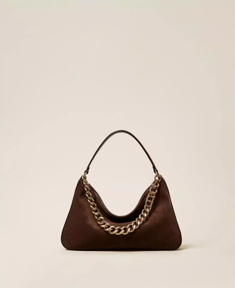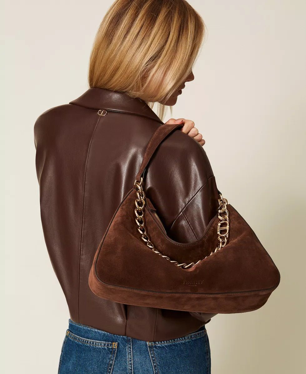 La borsa hobo 'Liliane' media in suede, realizzata in Italia, combina stile e funzionalità con pelle scamosciata trattata anti stingimento. La struttura a colonna, rinforzata in microfibra e impreziosita dal logo impresso a caldo, è foderata in twill misto cotone per durabilità e comfort. Grazie ai due manici staccabili — uno in pelle imbottita sagomata e l'altro in catena dorata leggera con l'iconico dettaglio Oval T — la borsa si presta a molteplici look, facili da personalizzare per ogni occasione.