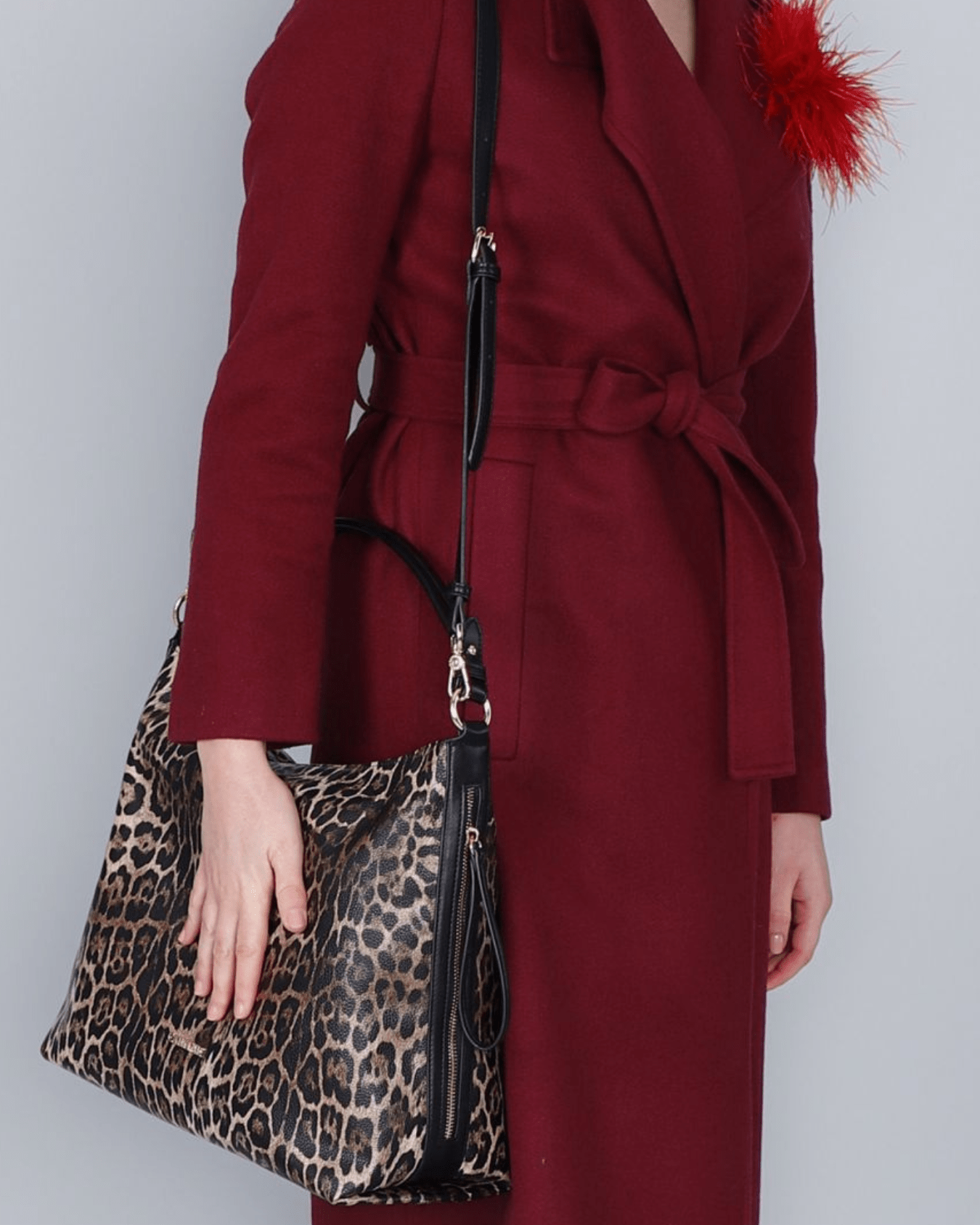 Questa borsa sacca animalier unisce praticità e stile audace grazie alla morbida effetto pelle con stampa leopardata. Le tasche con zip, il lettering metallico e il charm aggiungono un tocco di personalità. Completa di tracolla removibile, è perfetta per chi cerca un accessorio versatile e casual, capace di valorizzare ogni look con grinta e comodità.