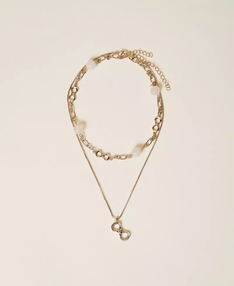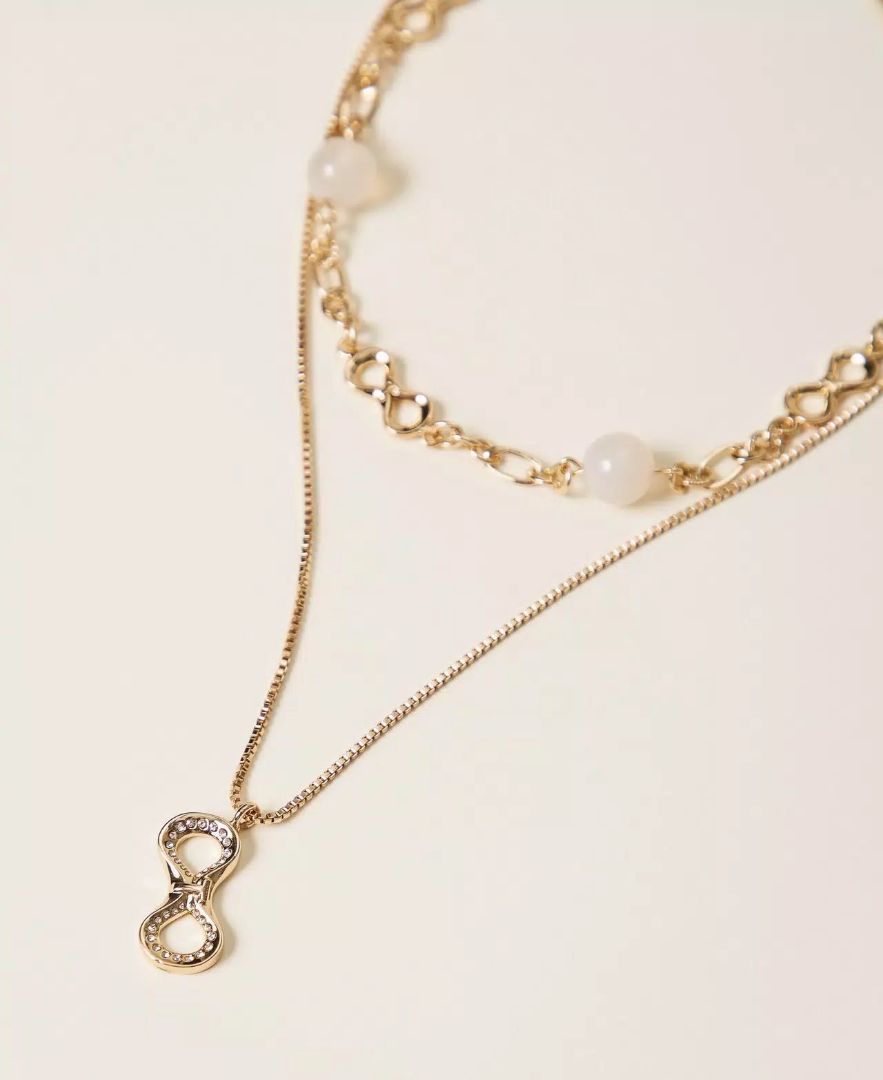 Collana in metallo a doppio giro con pietre a perla trasparenti e pendente con logo.