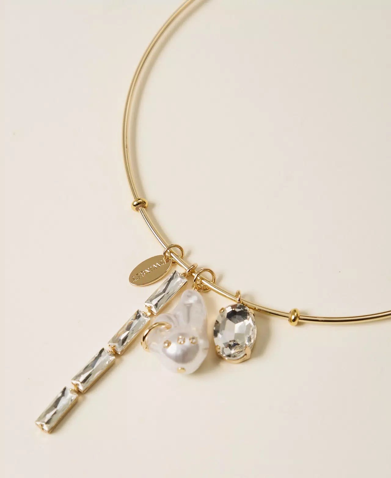Collana rigida in ottone con perla, castone strass, pendente a catena di baguette cristallo, placchetta logo, chiusura con gancio sul retro.