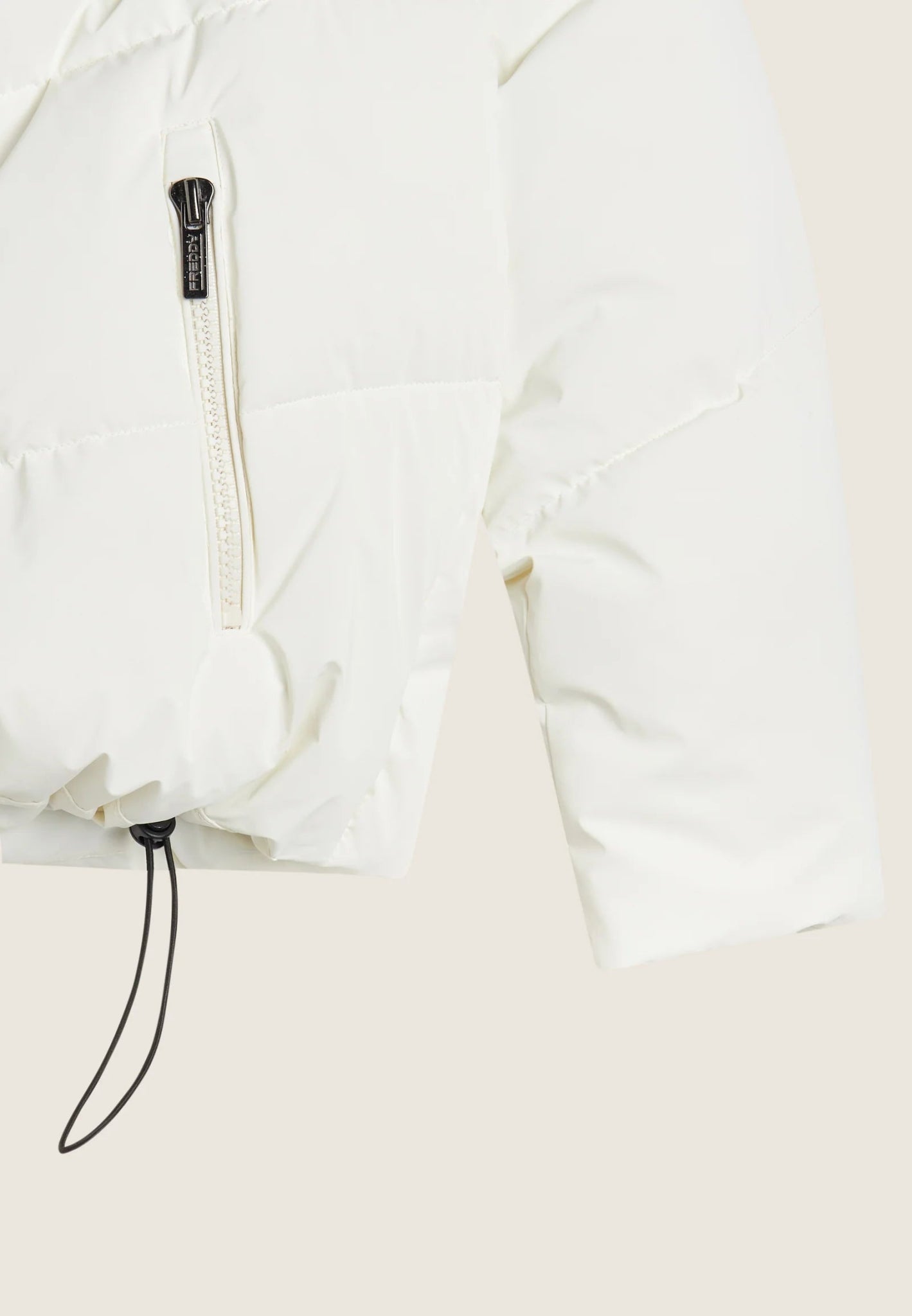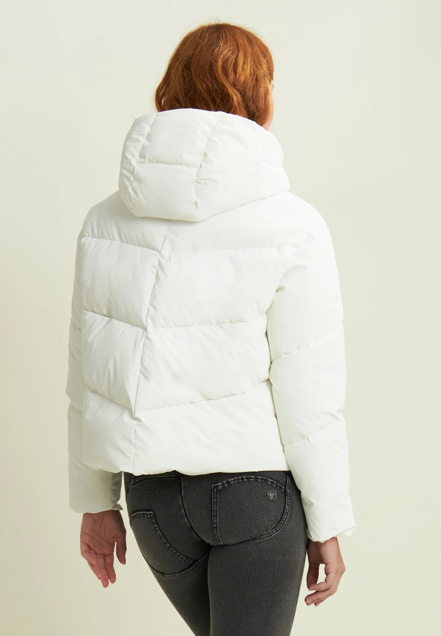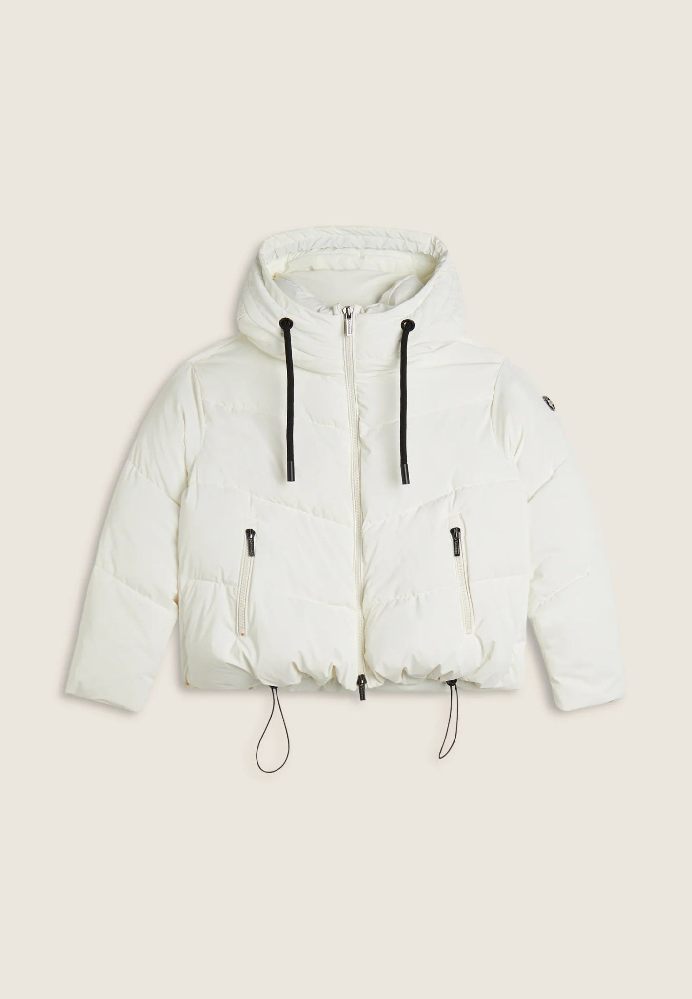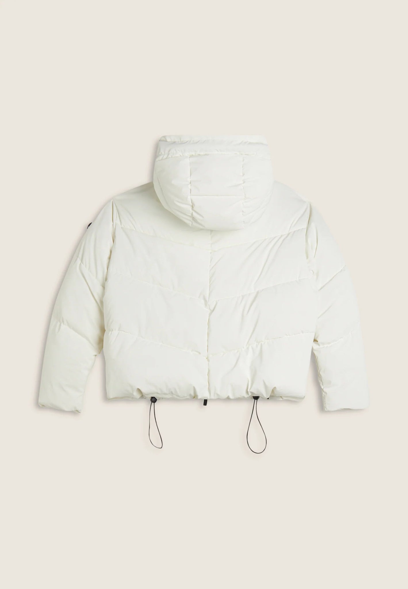 Piumino cropped dalla vestibilità comfort, perfetto per uno stile sportivo e dinamico. Il fit può essere regolato grazie alla coulisse con stopper sul fondo. Imbottito in fake-down animal-friendly, protegge dal freddo mantenendo leggerezza e morbidezza. Collo alto e cappuccio con coulisse, maniche lunghe dritte e tasche con zip per un look versatile e funzionale. Logo con strass applicato sulla manica sinistra.