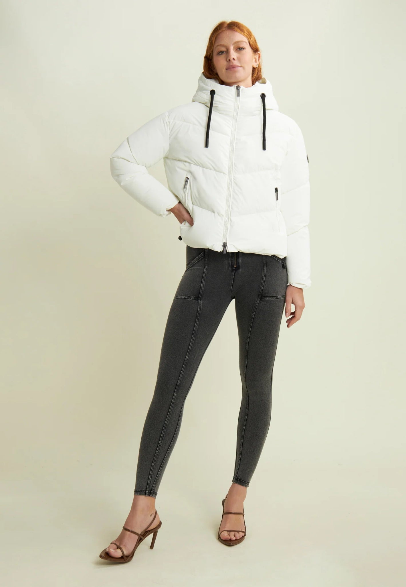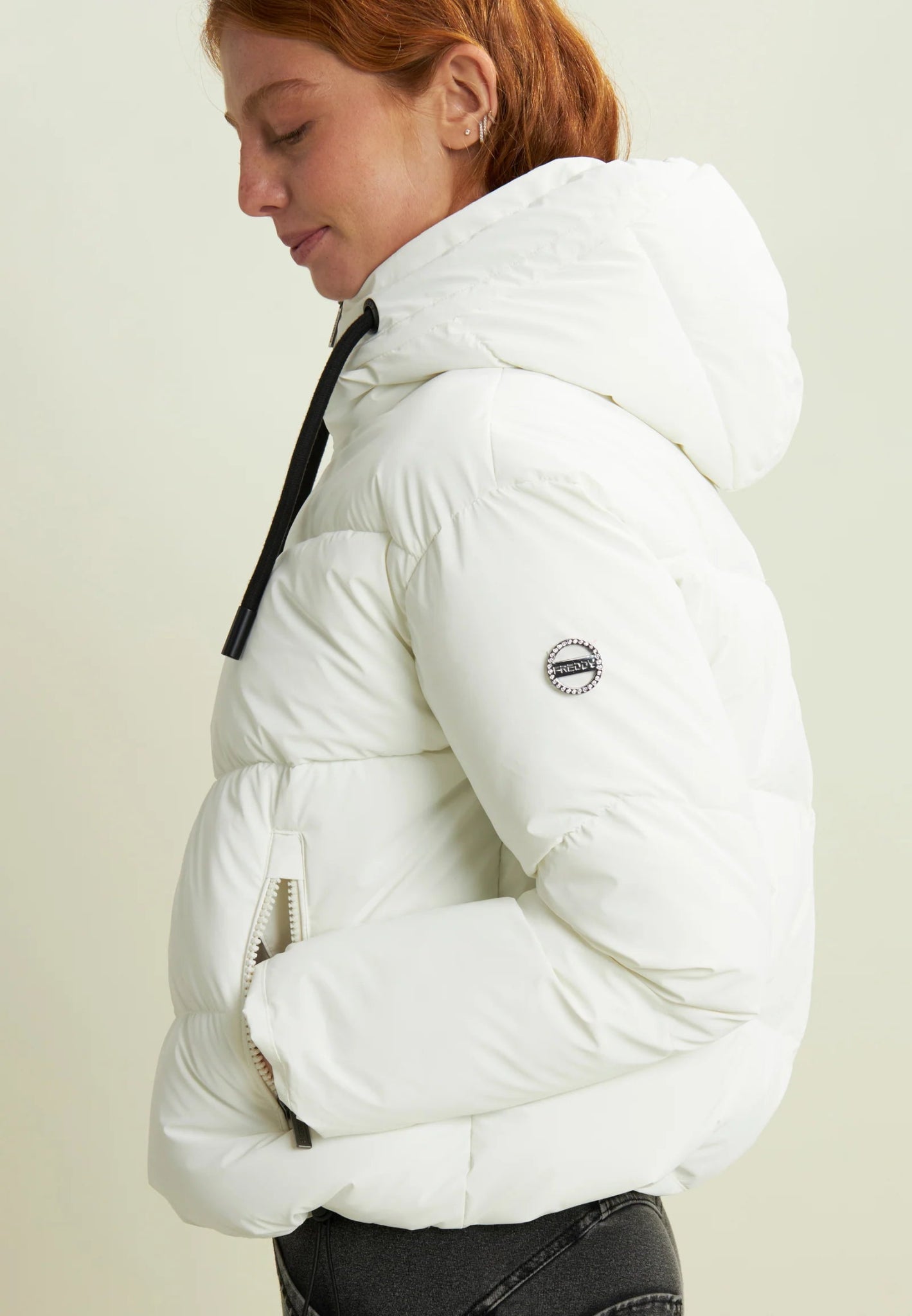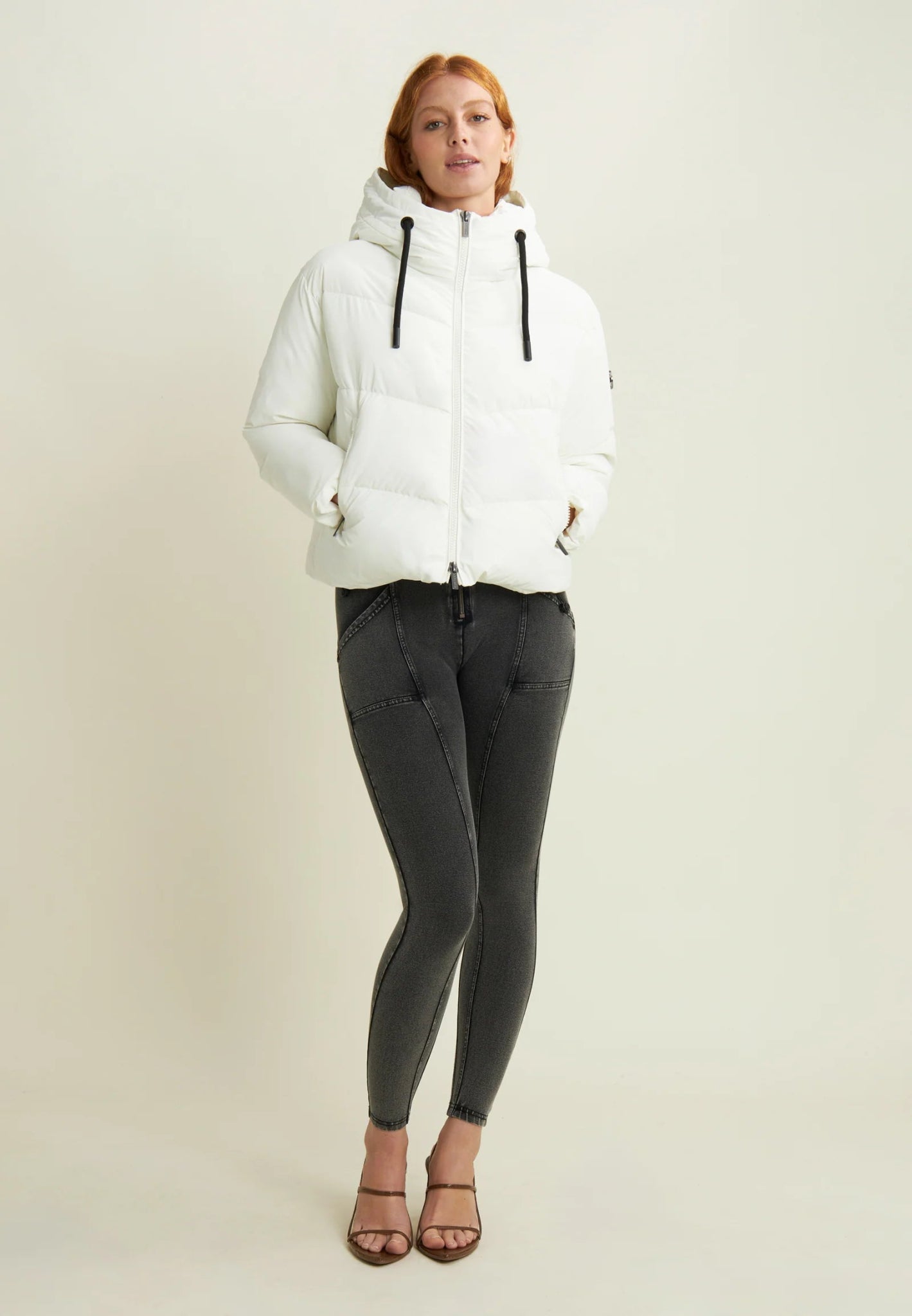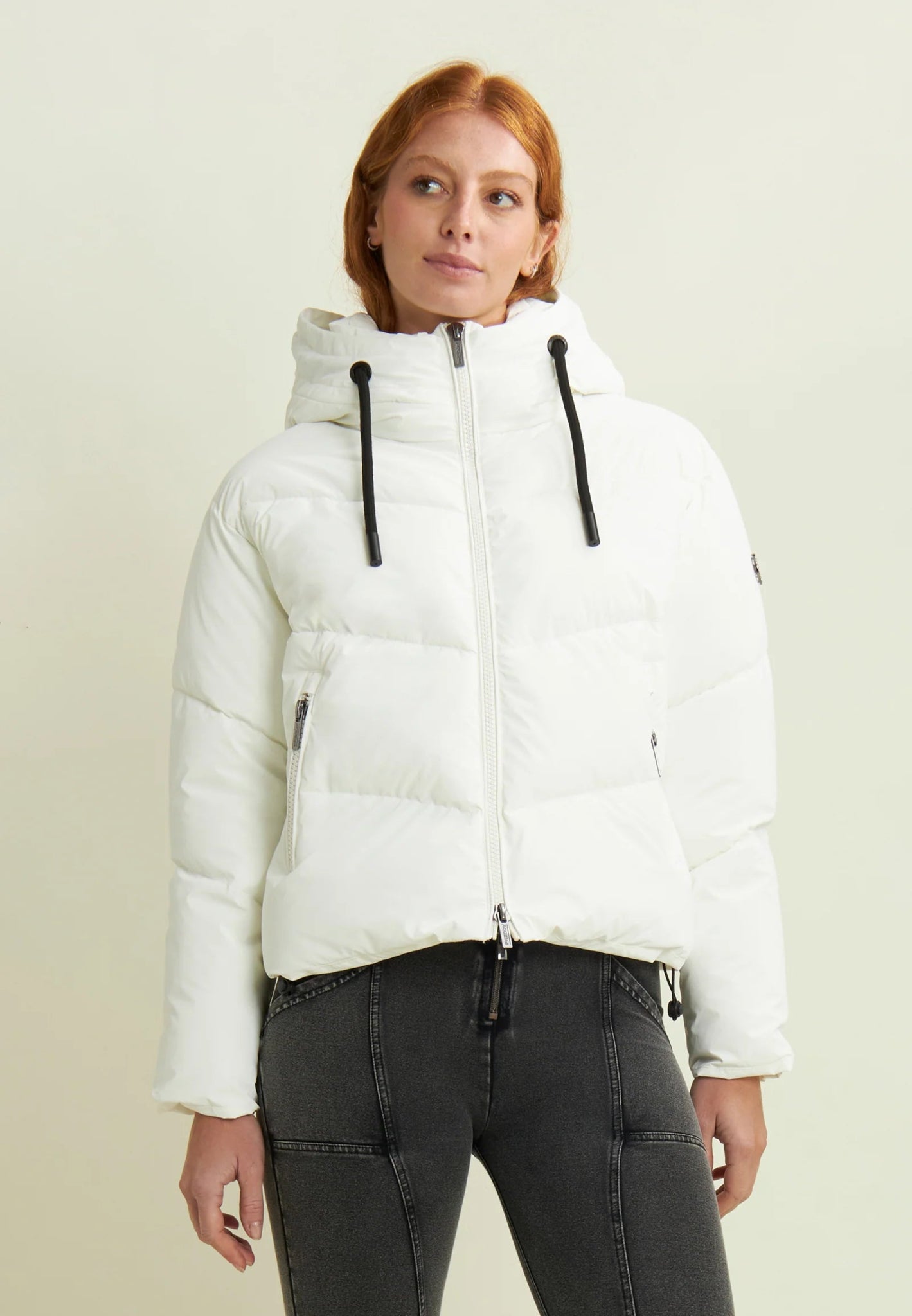 Piumino cropped dalla vestibilità comfort, perfetto per uno stile sportivo e dinamico. Il fit può essere regolato grazie alla coulisse con stopper sul fondo. Imbottito in fake-down animal-friendly, protegge dal freddo mantenendo leggerezza e morbidezza. Collo alto e cappuccio con coulisse, maniche lunghe dritte e tasche con zip per un look versatile e funzionale. Logo con strass applicato sulla manica sinistra.