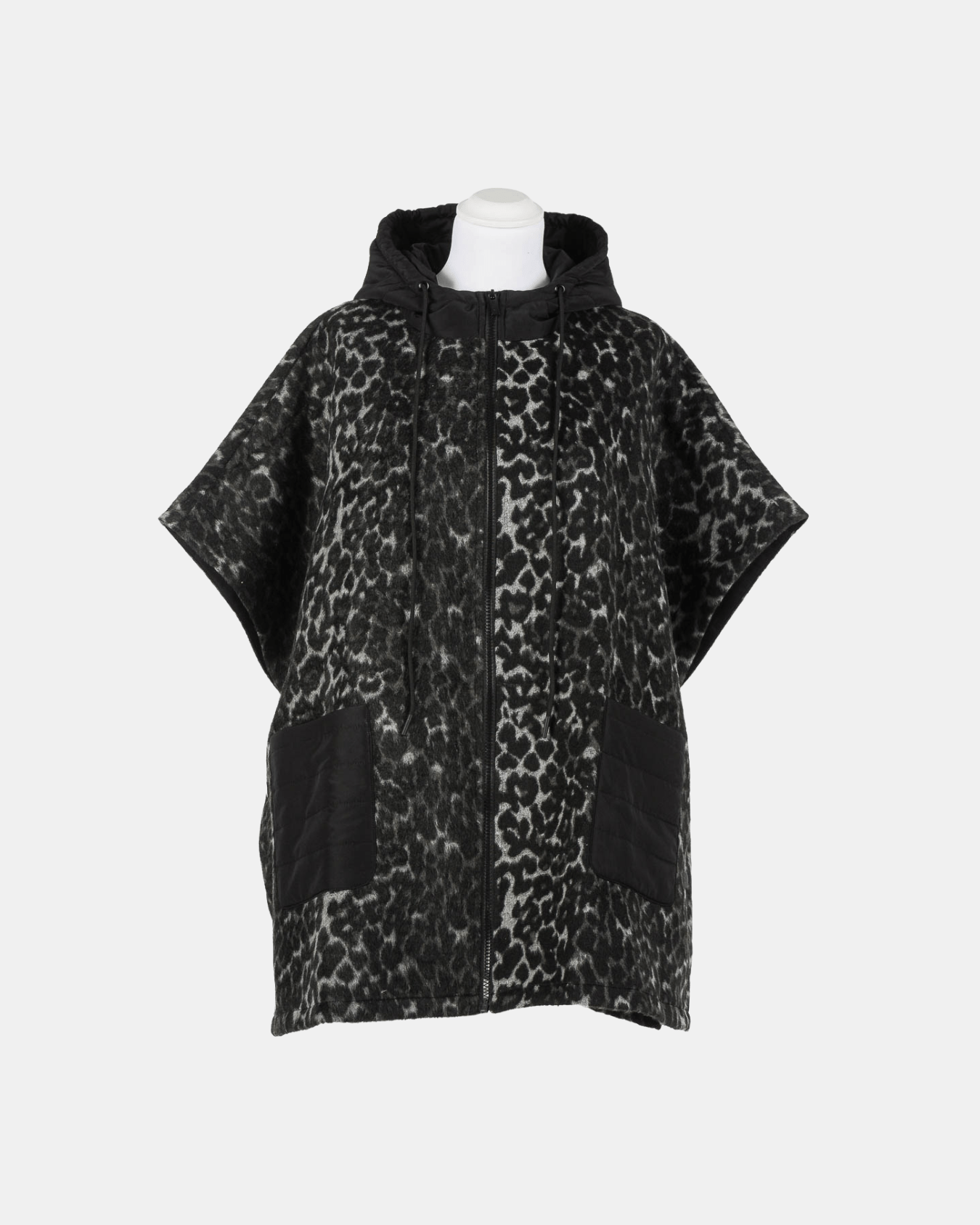 Poncho in panno con stampa animalier maculata. Ha cappuccio con coulisse e tasche applicate in nylon trapuntato, chiusura con zip pressofusa, bottoni a pressione al fianco.