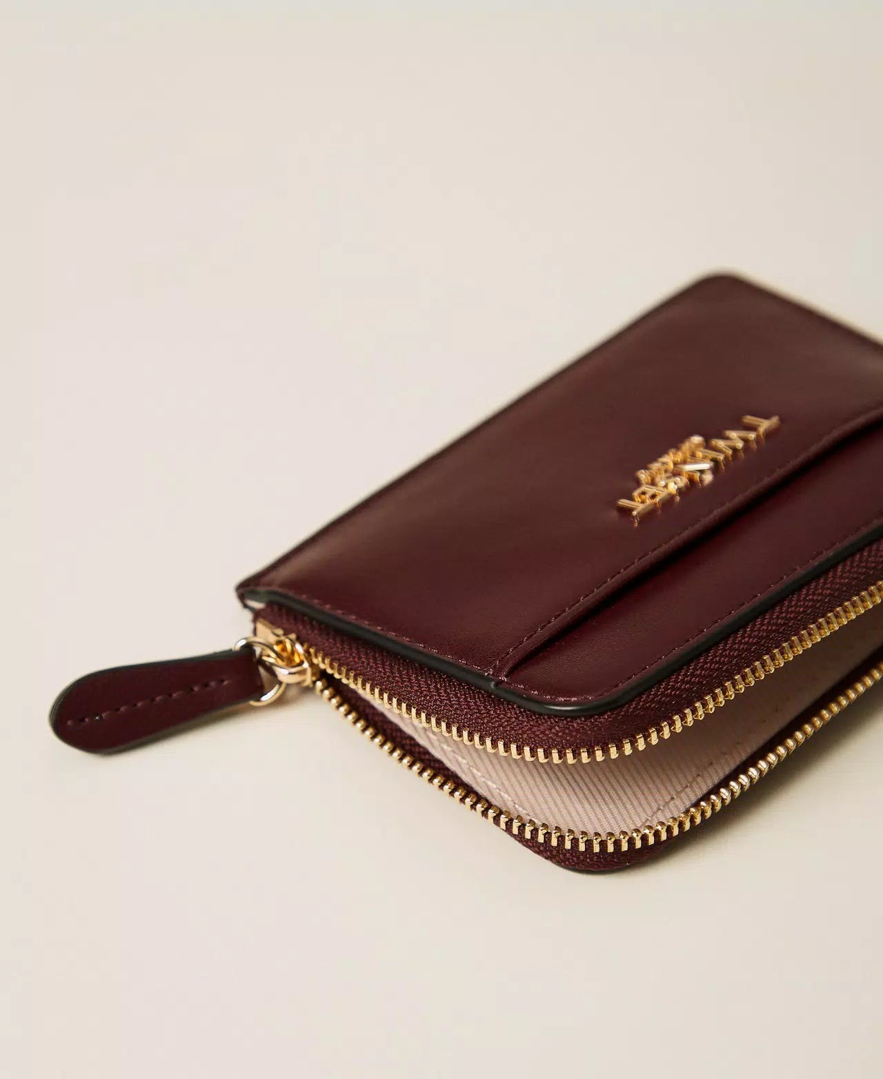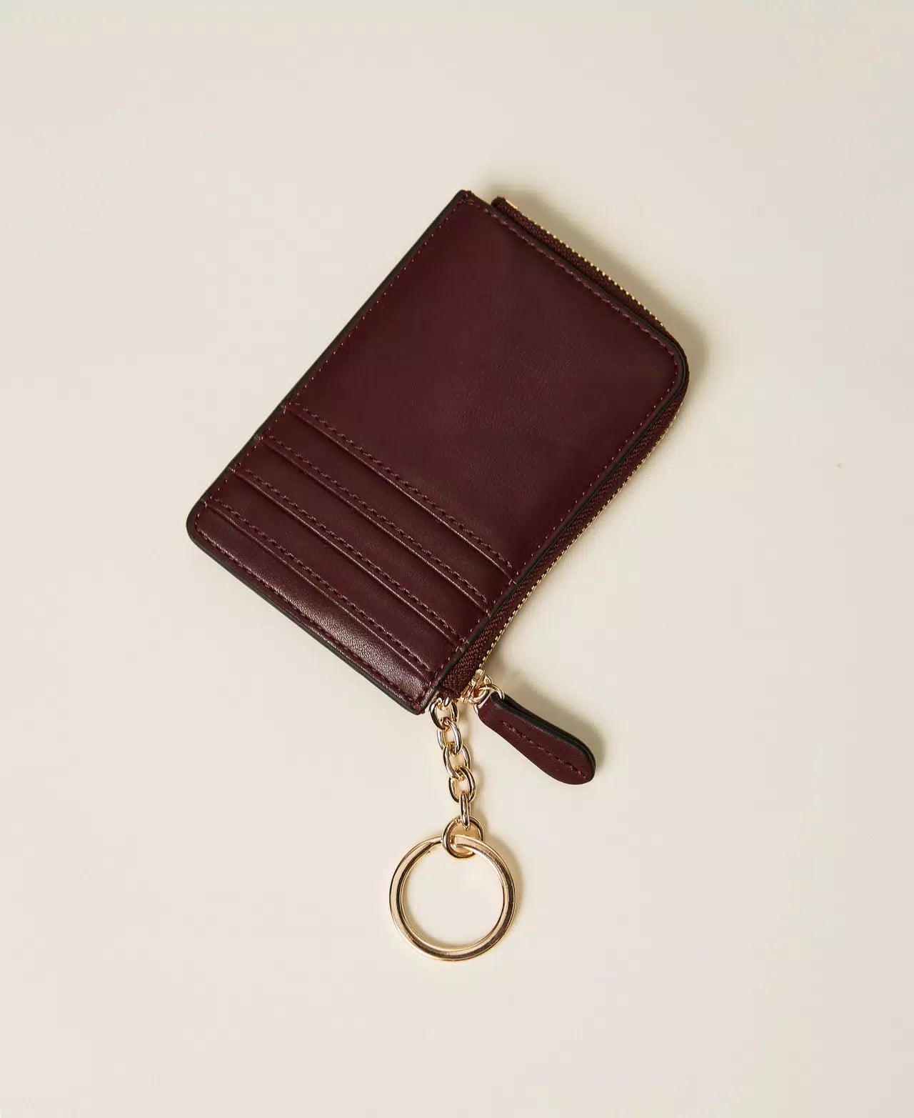 Elegante portacarte in ecopelle di vitello liscio, arricchito da un raffinato logo lettering in metallo. Dotato di una pratica catena con anello portachiavi e di una zip a L che nasconde una comoda tasca per chiavi e monete, questo accessorio unisce stile e funzionalità, ideale per organizzare con sicurezza i tuoi oggetti essenziali.