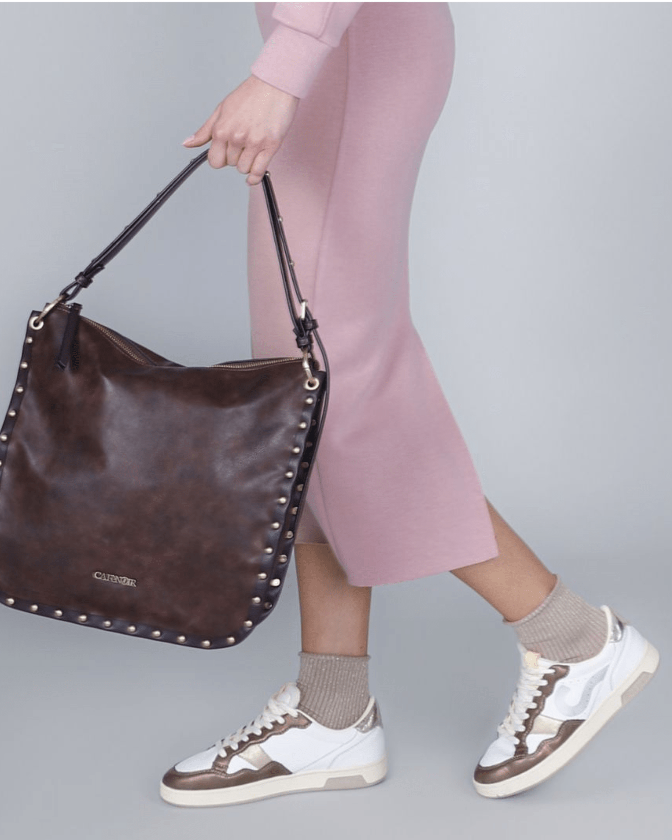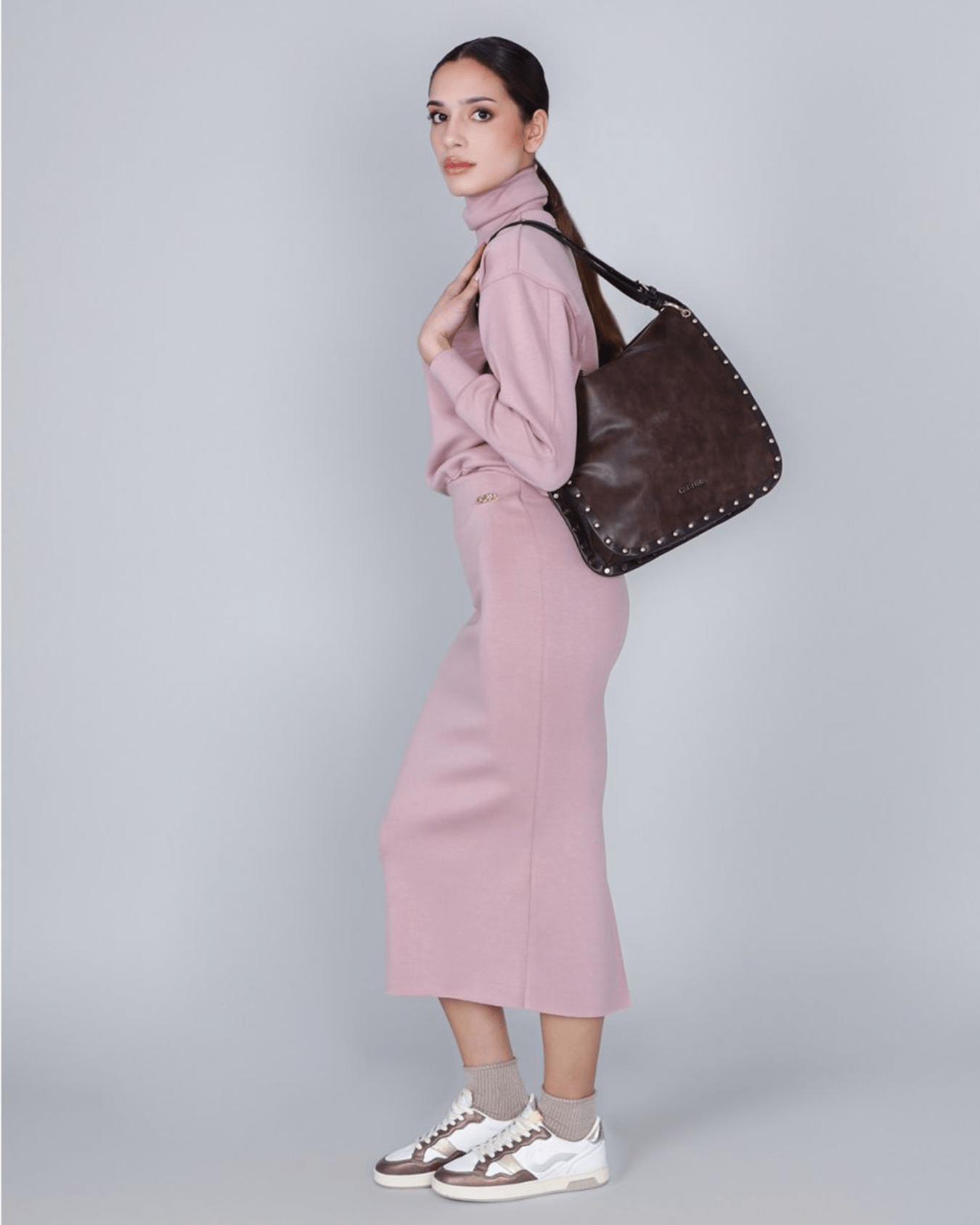 Sacca morbida in similpelle dall'effetto vissuto e sfumato con bordi decorati da rivetti. logo in metallo e tracolla regolabile per uno stile casual e grintoso