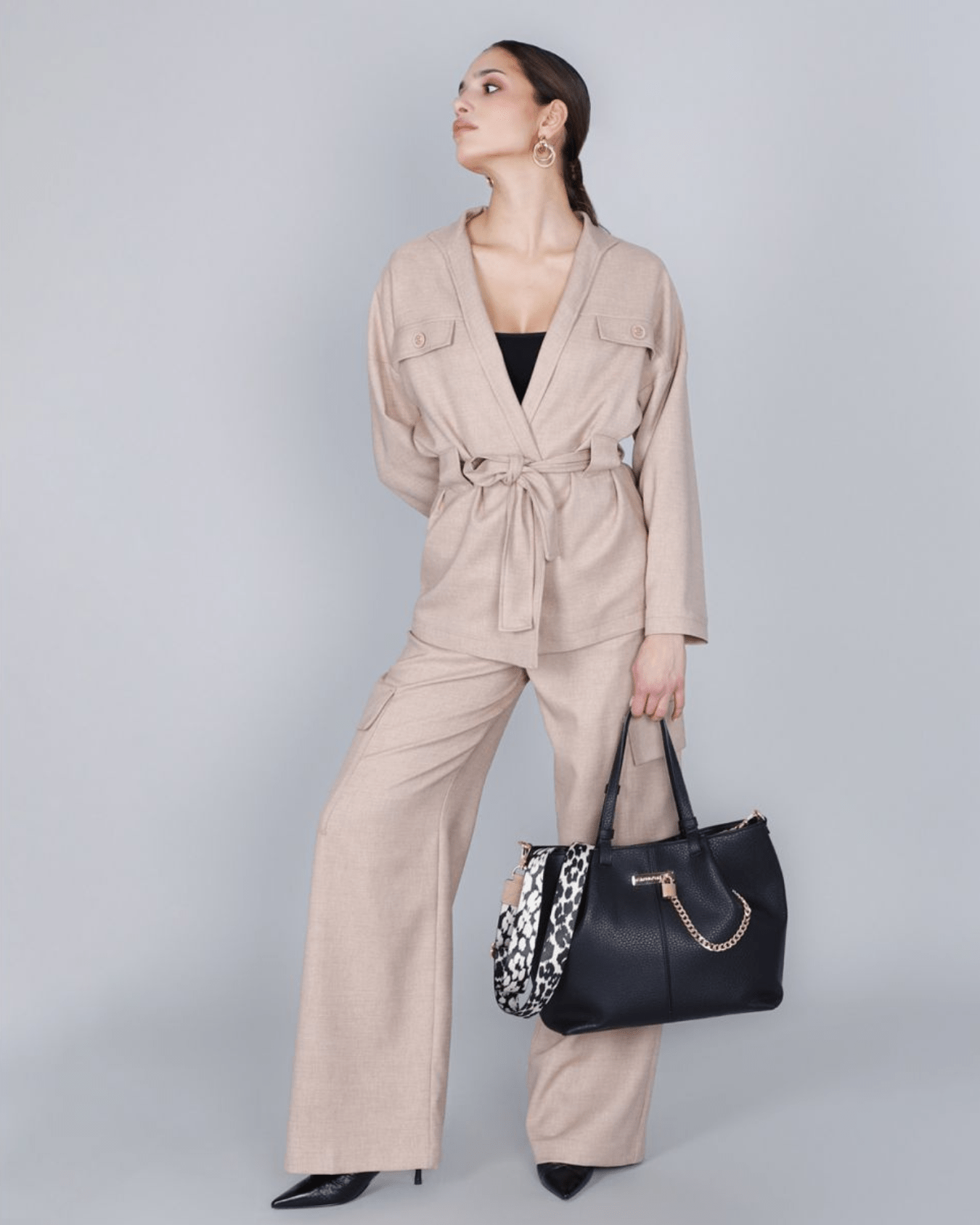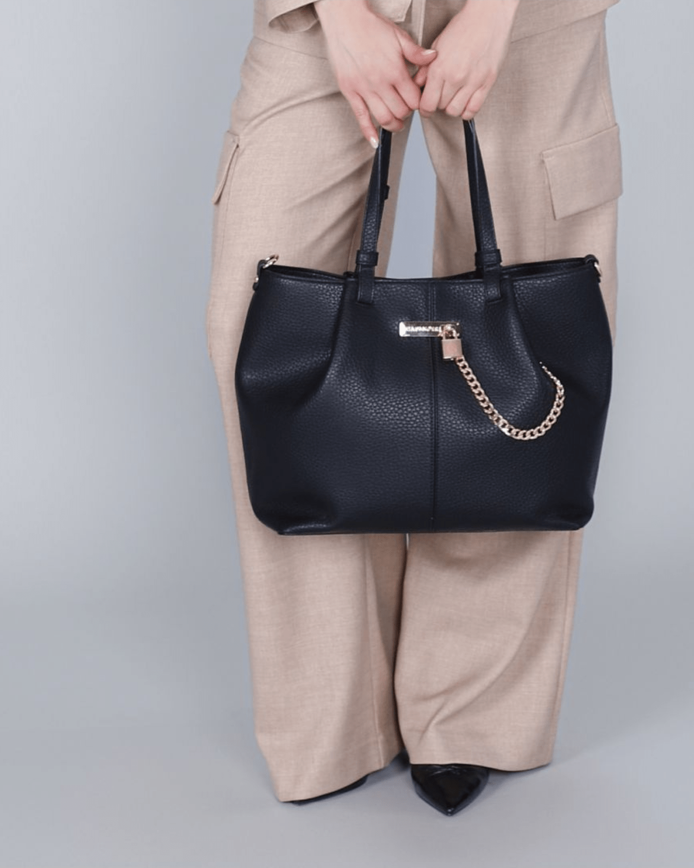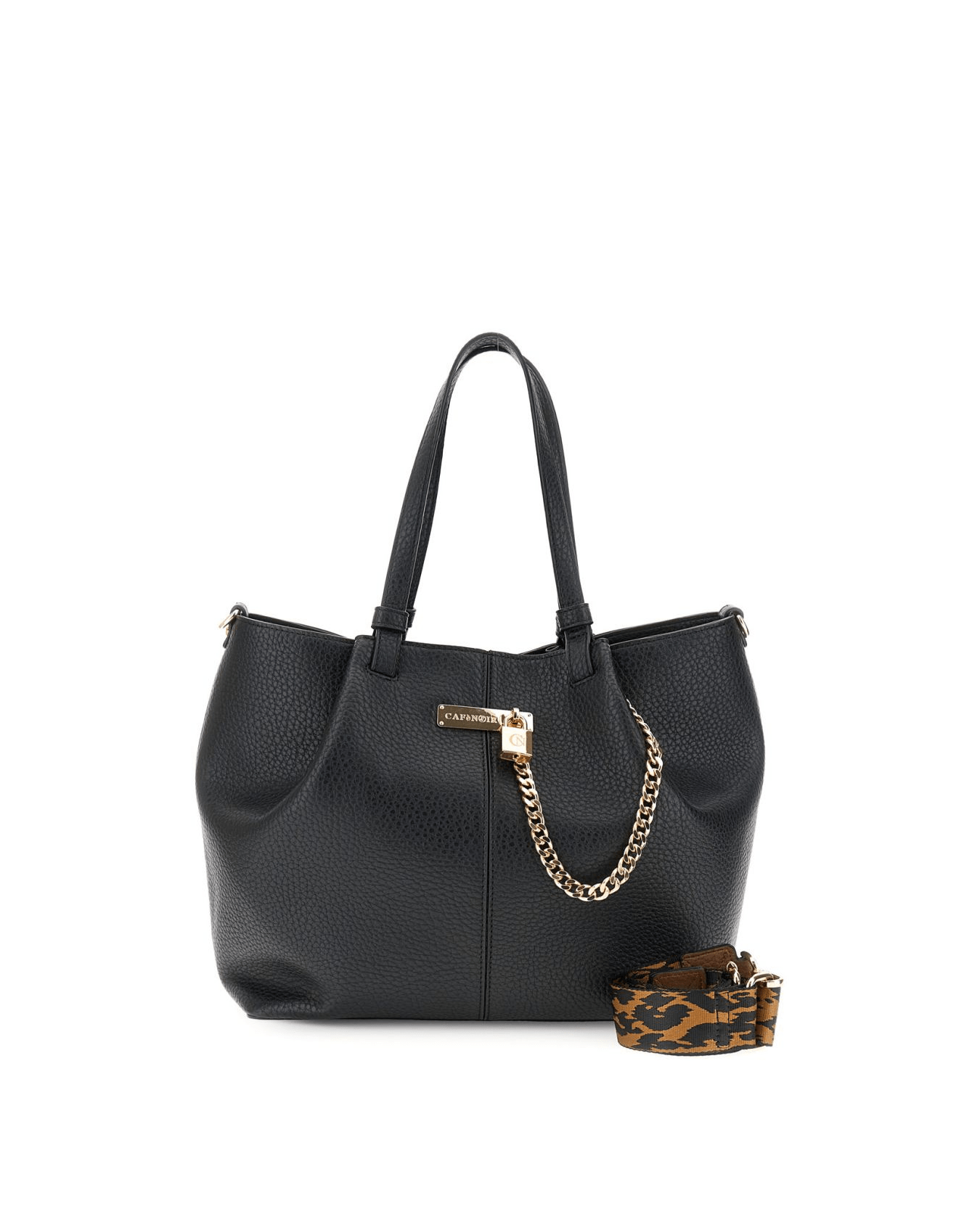 Questa shopping bag effetto pelle grana grossa nero combina stile deciso e femminilità unica. Il dettaglio della catena con logo e lucchetto aggiunge un tocco di carattere, mentre la tracolla a nastro animalier removibile permette di personalizzare il look ogni giorno. Perfetta per chi cerca un accessorio distintivo e versatile, capace di valorizzare ogni outfit con eleganza grintosa.