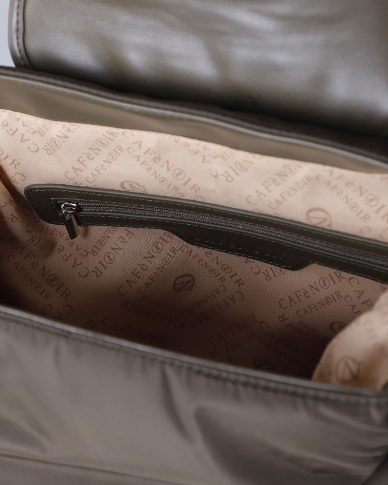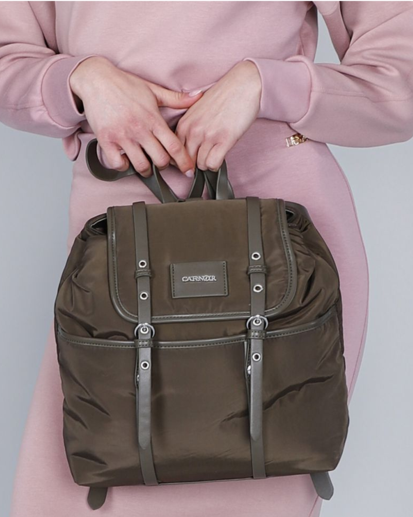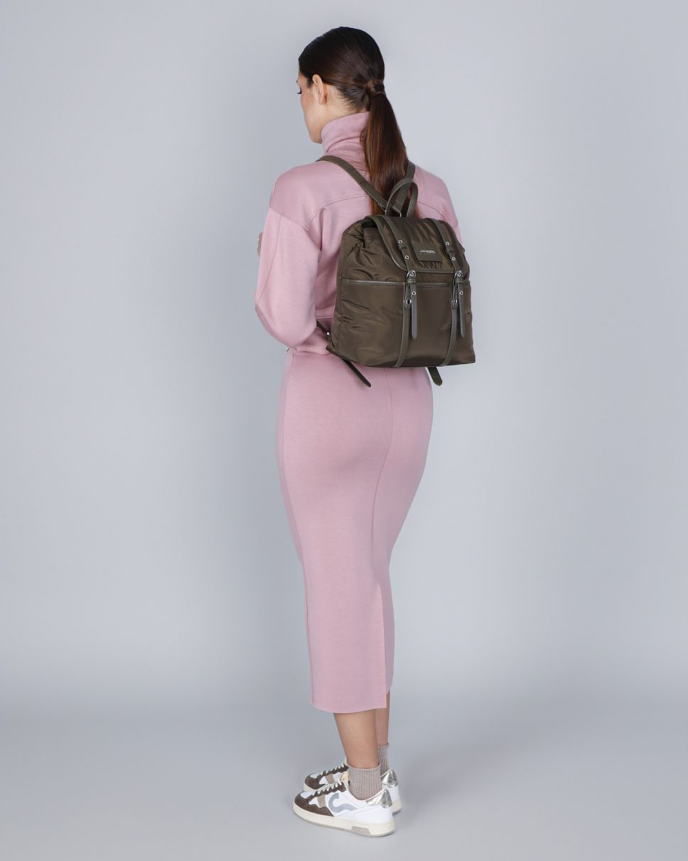 Zaino in nylon con pattina e tasca frontale arricchito da cinghie regolabili con fibbie e occhielli a vela. logo in metallo con lettering per uno stile urban distintivo.